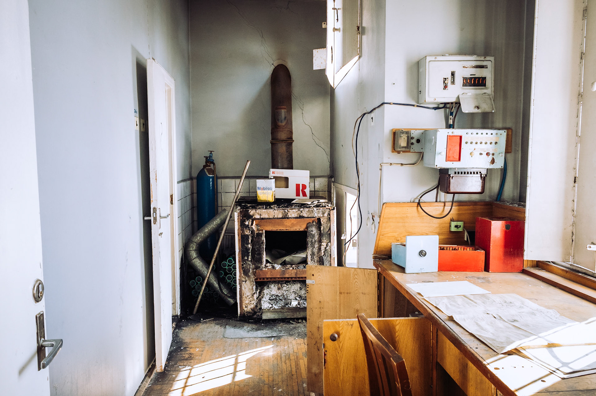 Dieses Bild zeigt ein altes KGB Büro in Pyramiden mit einem Ofen, indem Dokumente verbrannt wurden und verrosteten Maschinen. Staub und Verfall prägen das Bild, während Sonnenlicht durch das offene Fenster auf den Boden fällt.