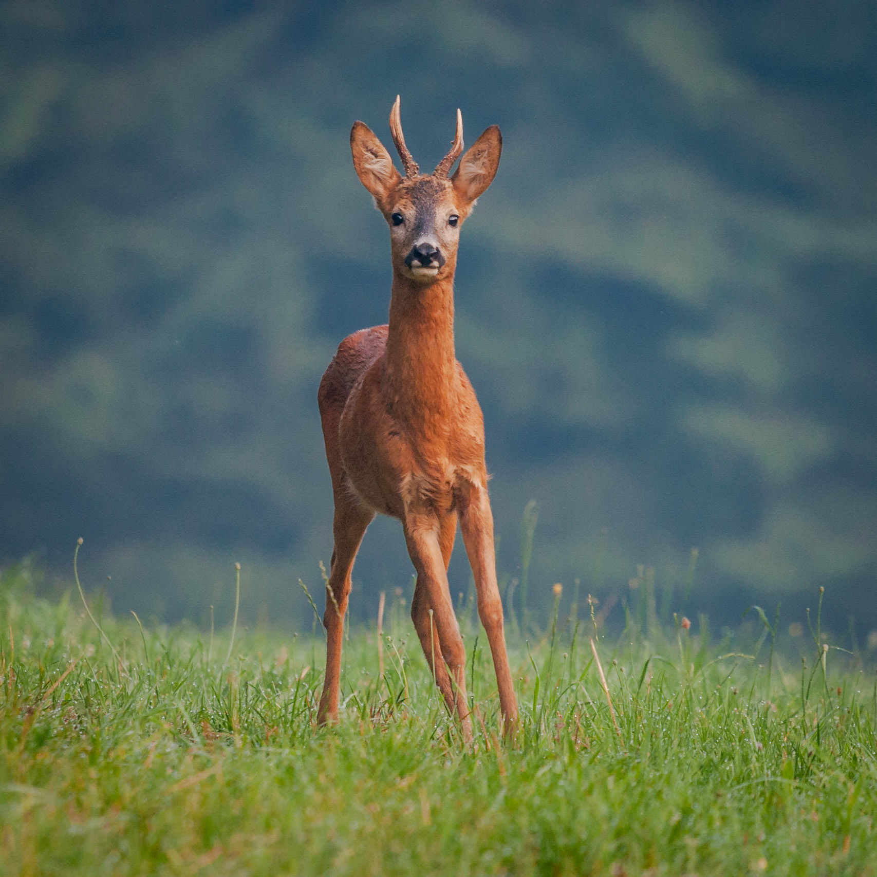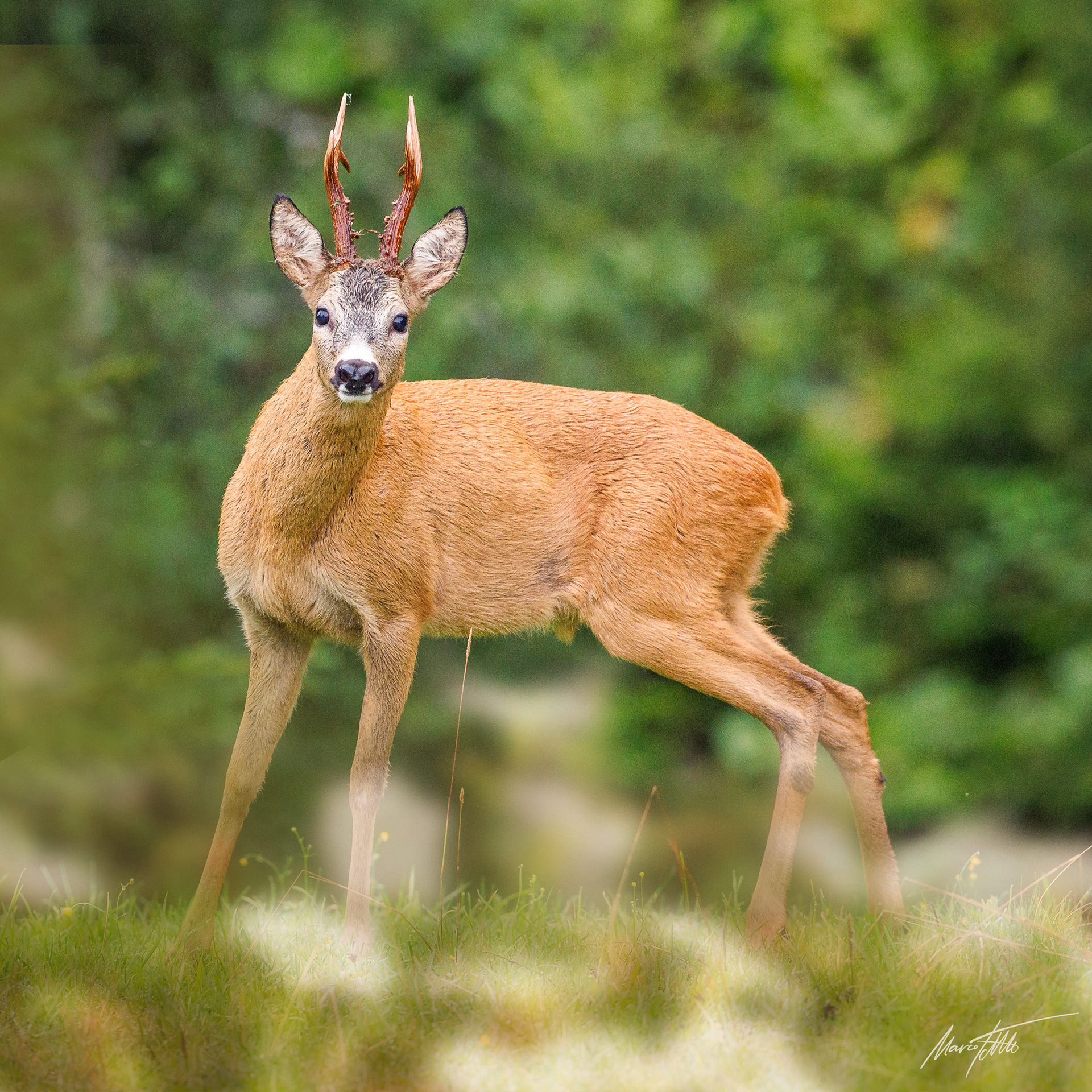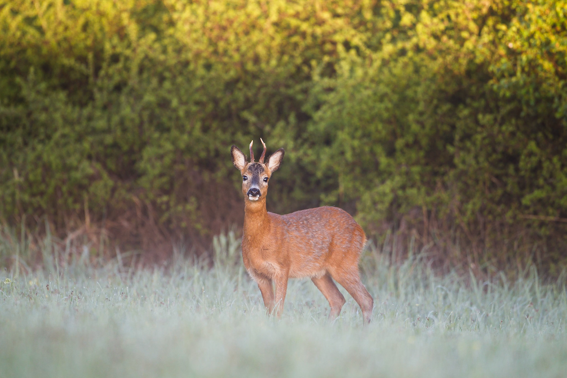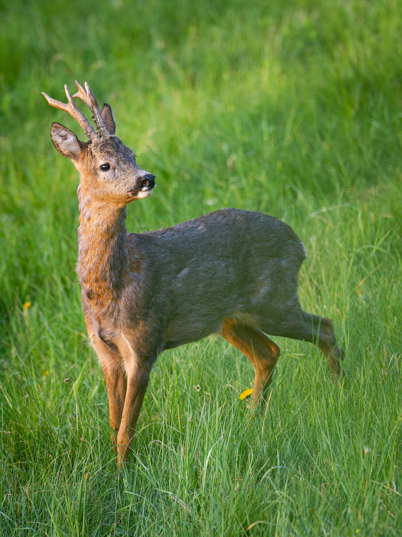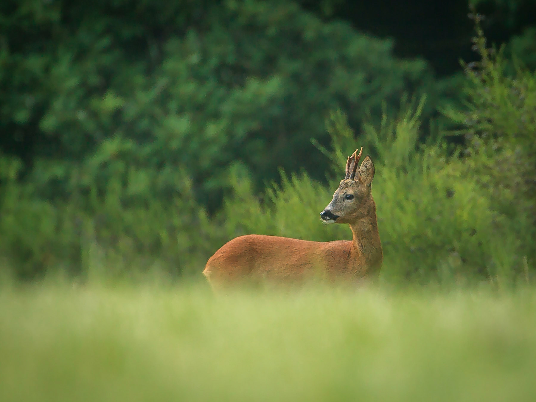 Ein über 10-jährigr Rehbock im Bast mit bliendem Licht auf der linken Seite (grauer Star) - der Bock wurde am Folgetag von einem Hund gerissen