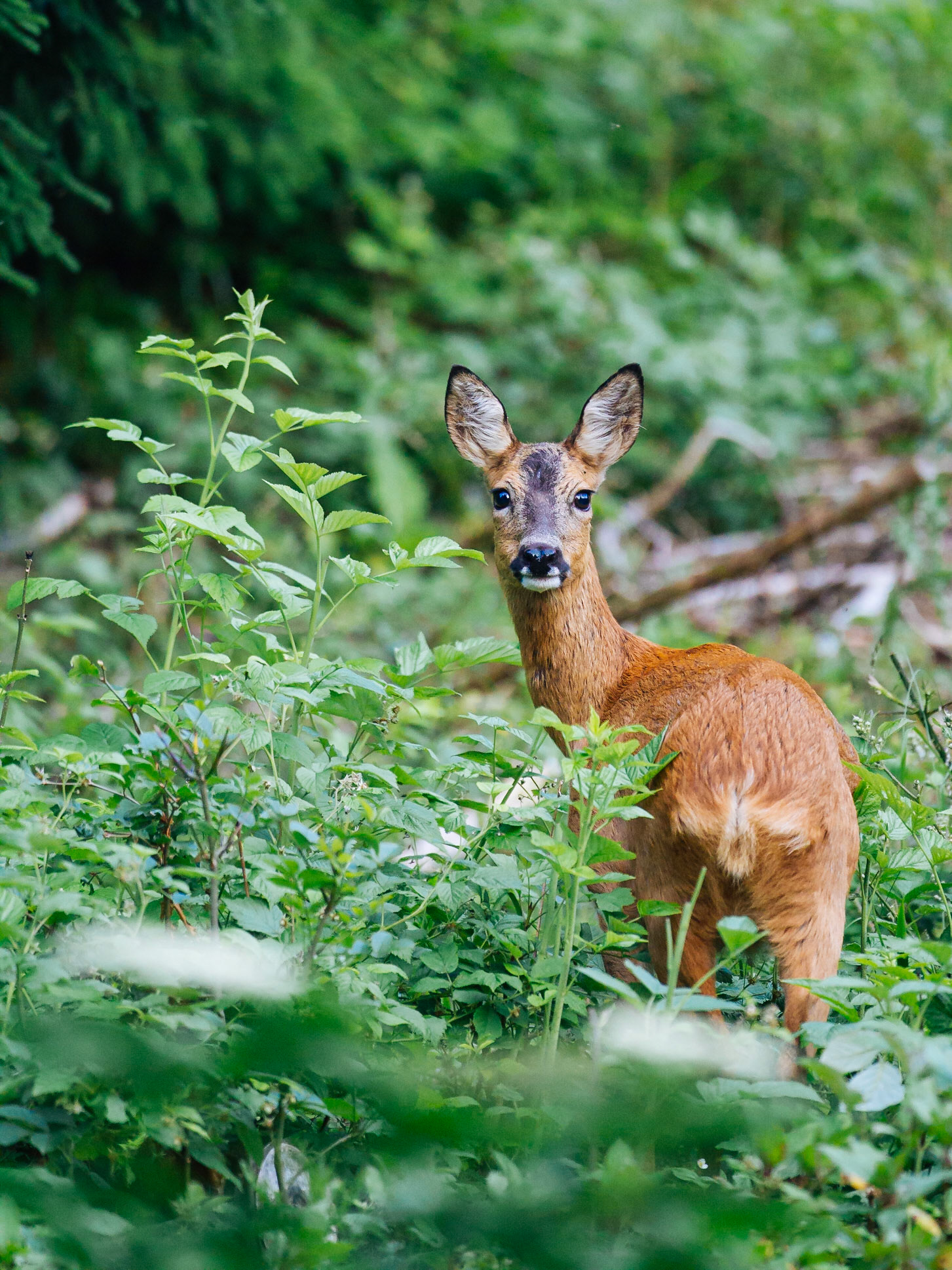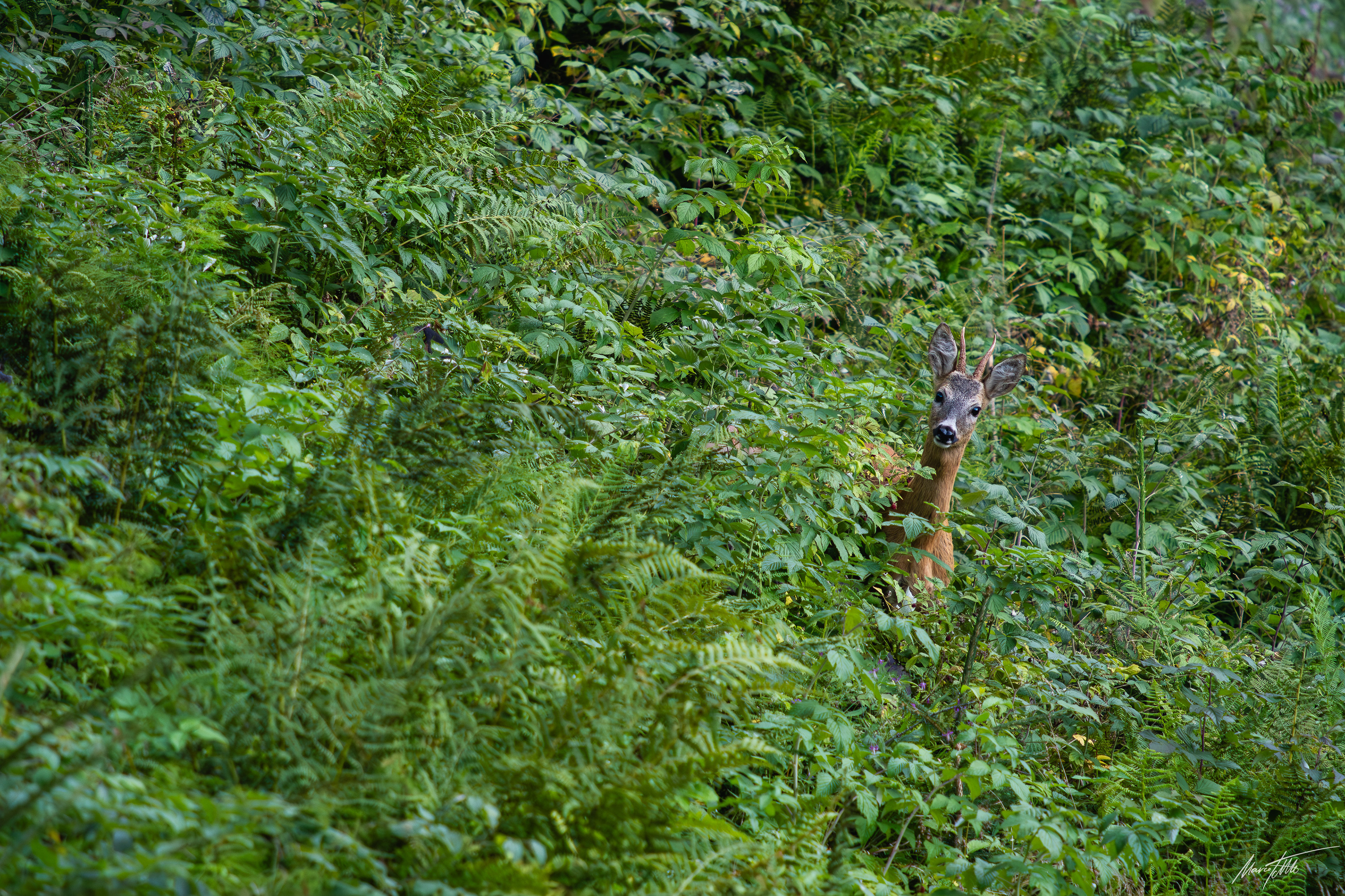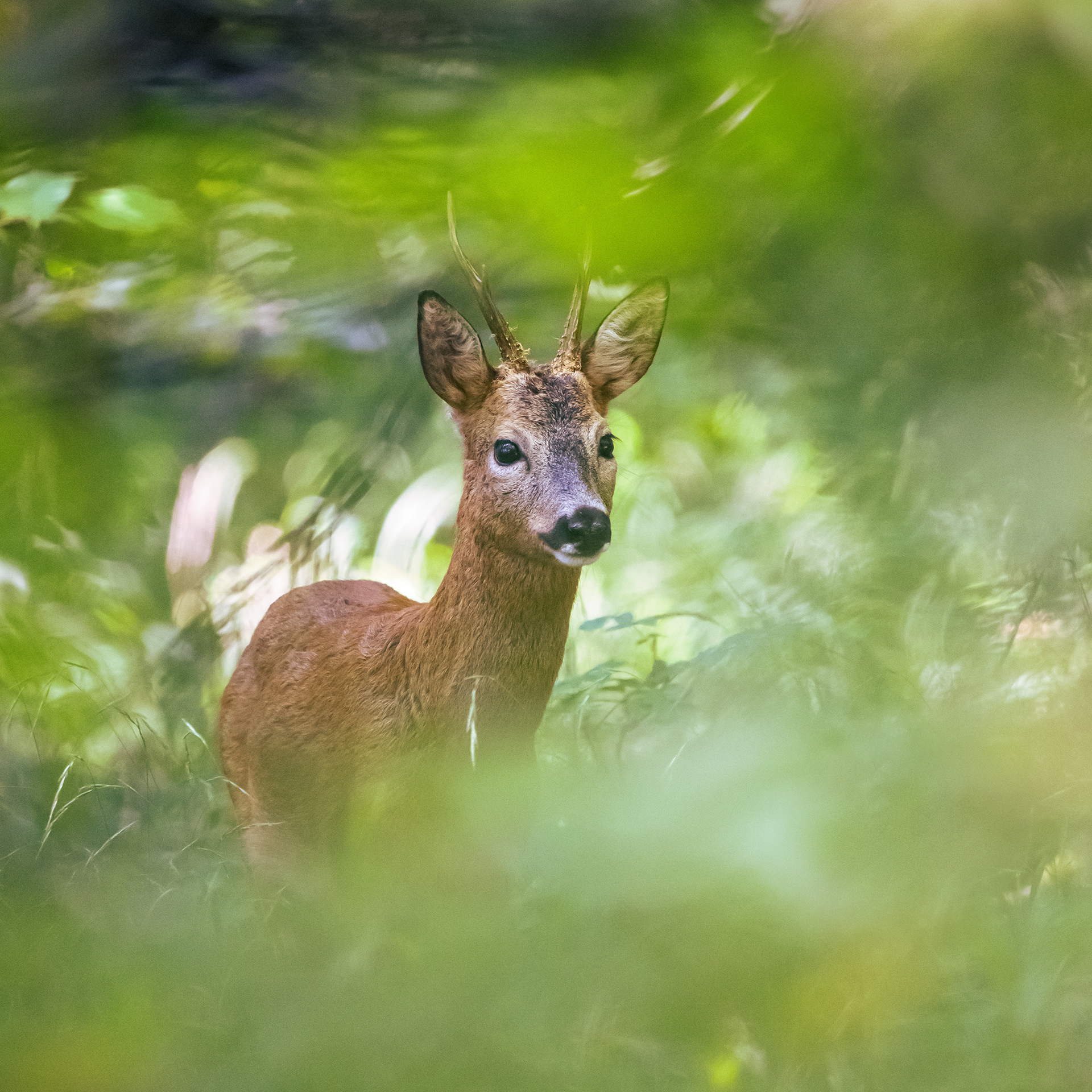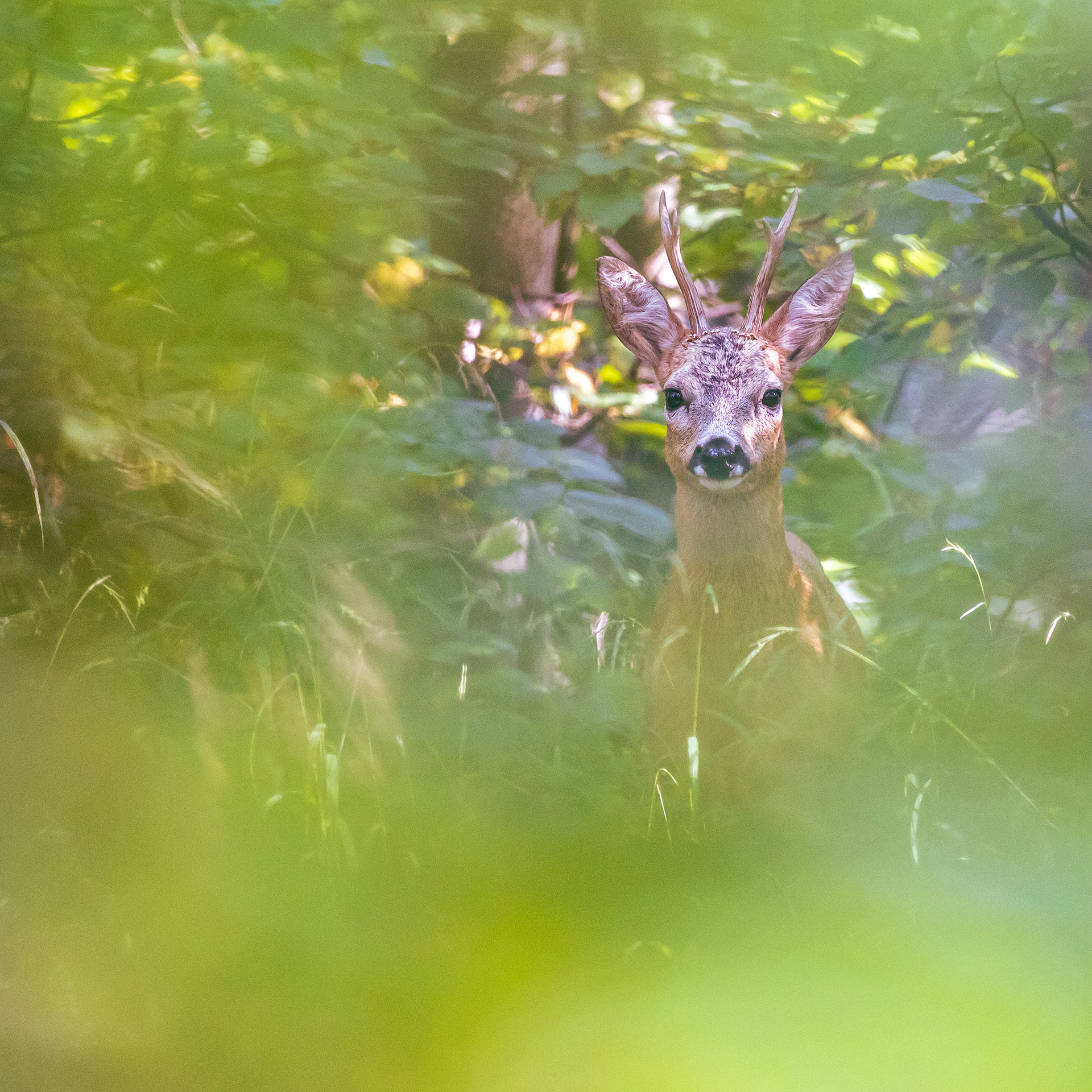 Alter Rehbock verhofft im dichten und grünen Unterholz