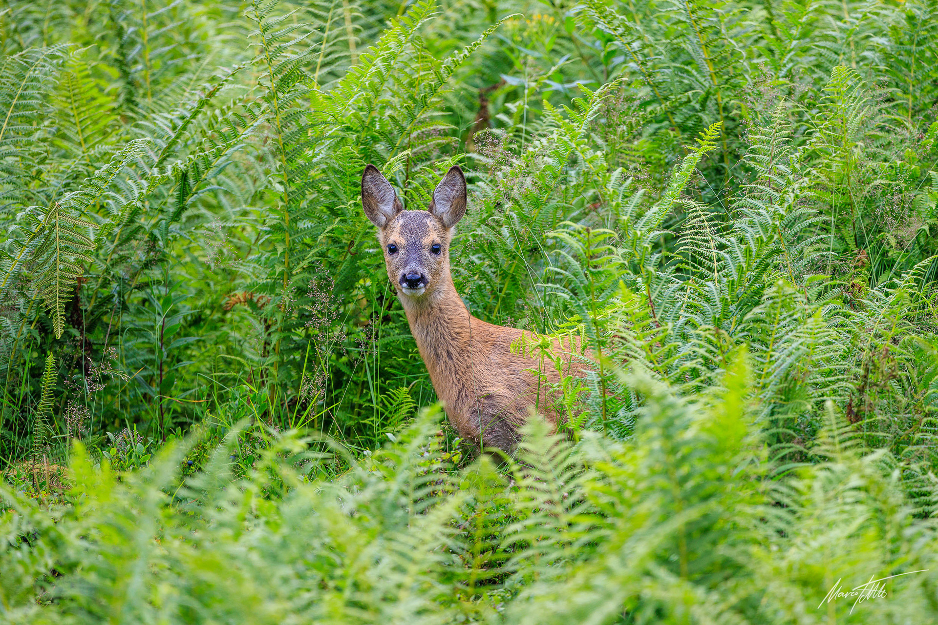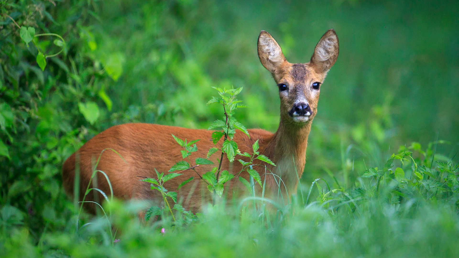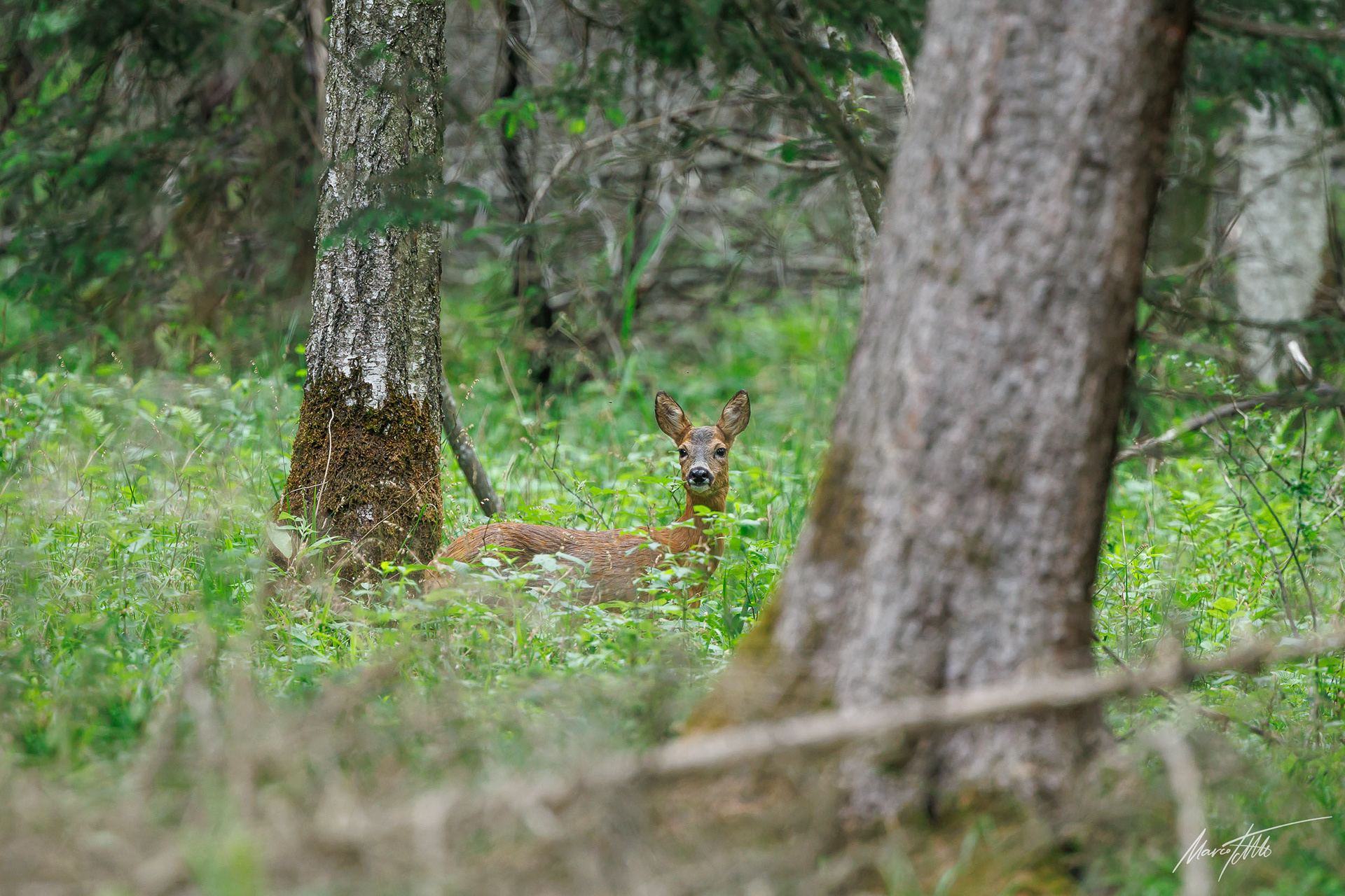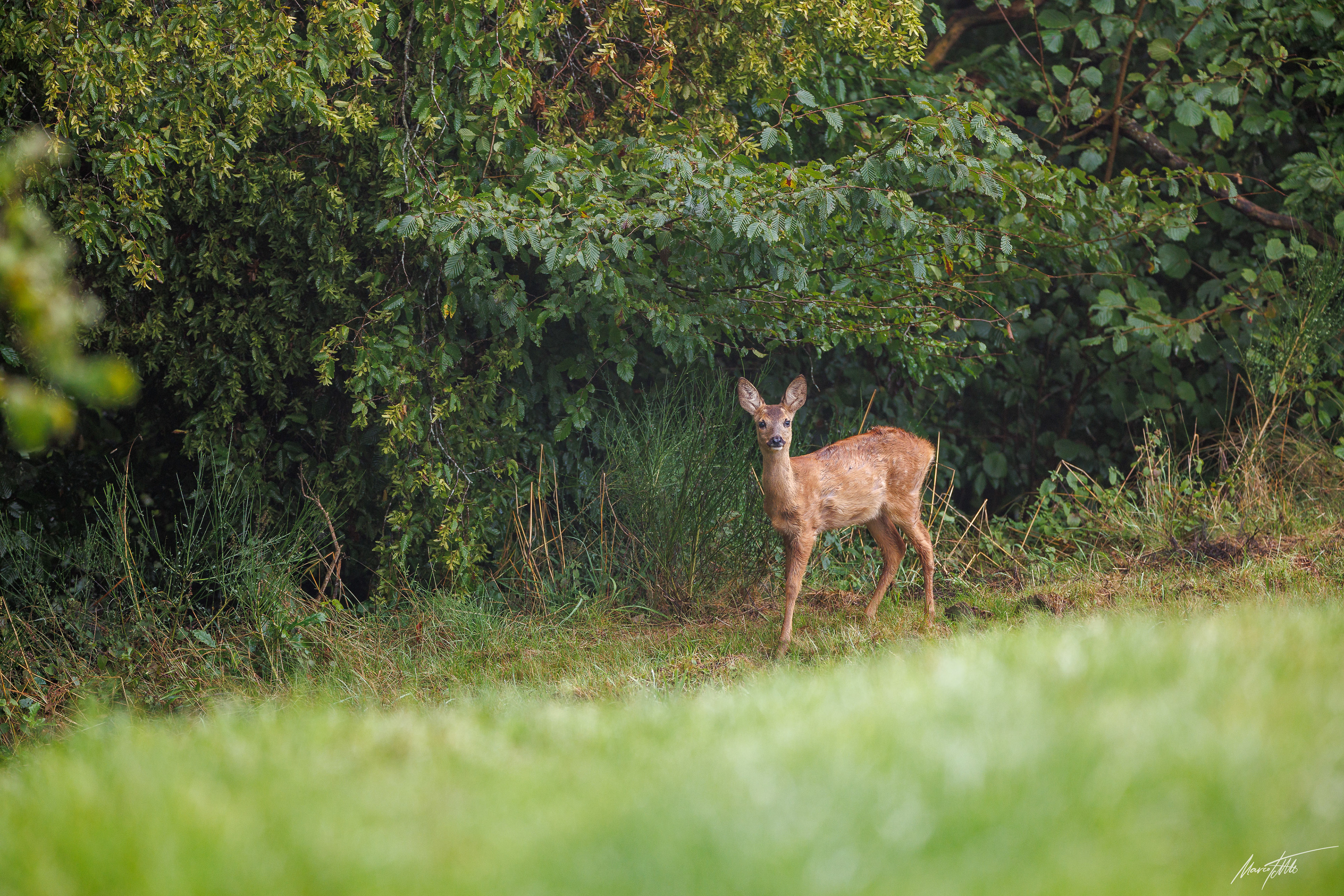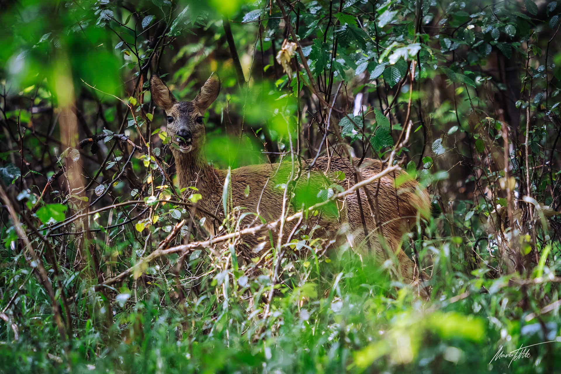 Alter Rehbock verhofft im dichten und grünen Unterholz
