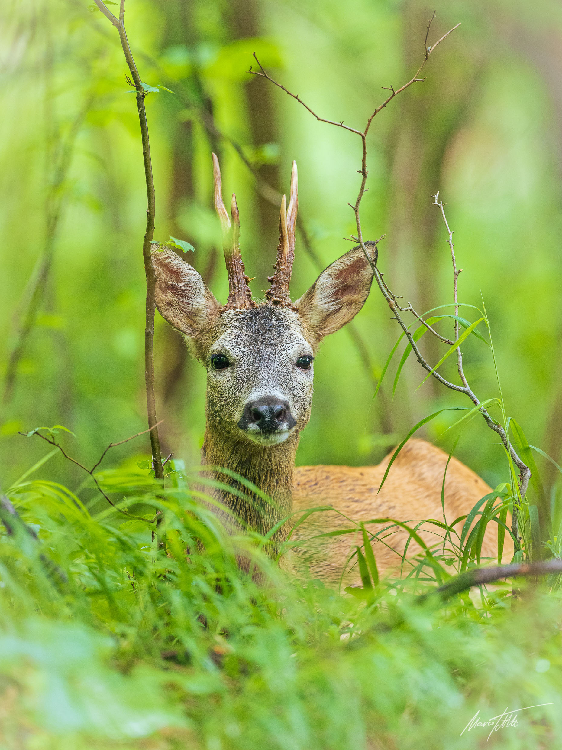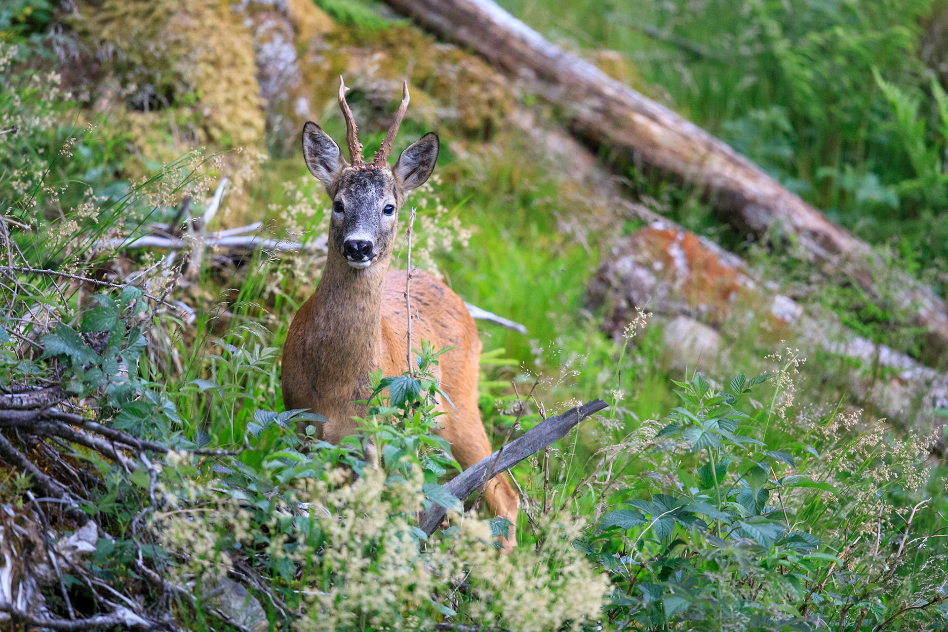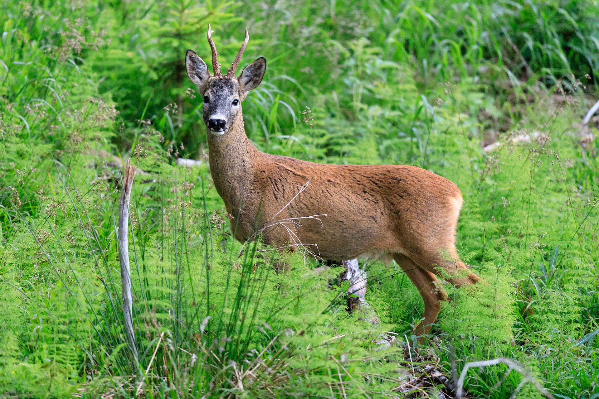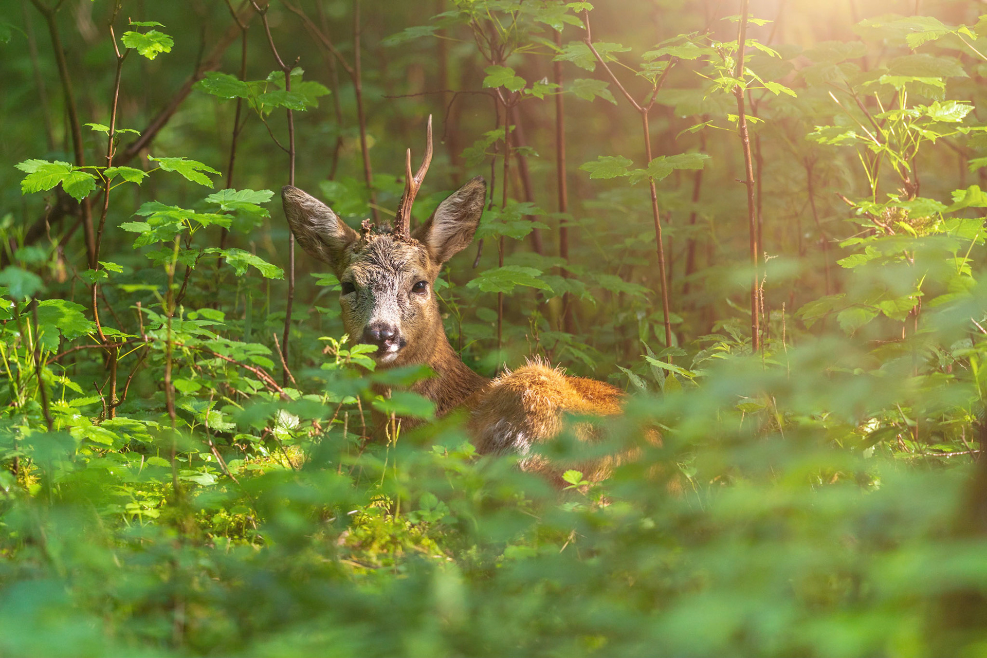 Alter und zurückgesetzter Rehbock markiert im grünen Unterholz sein Revier