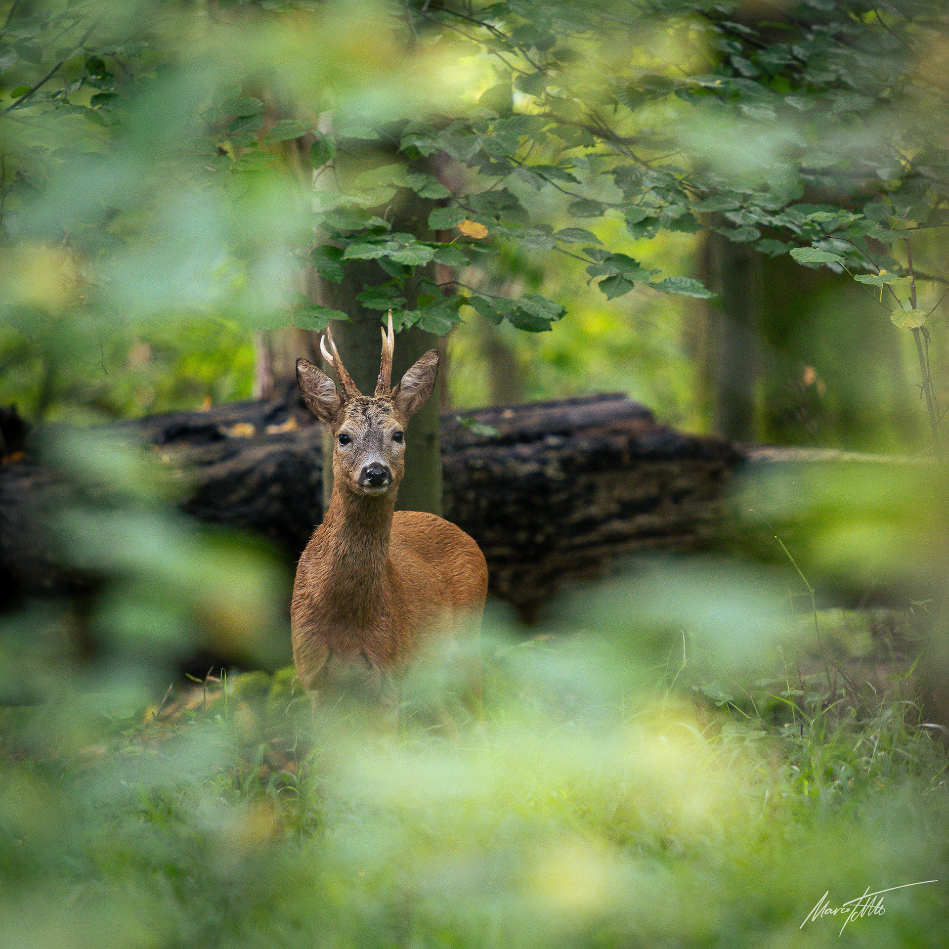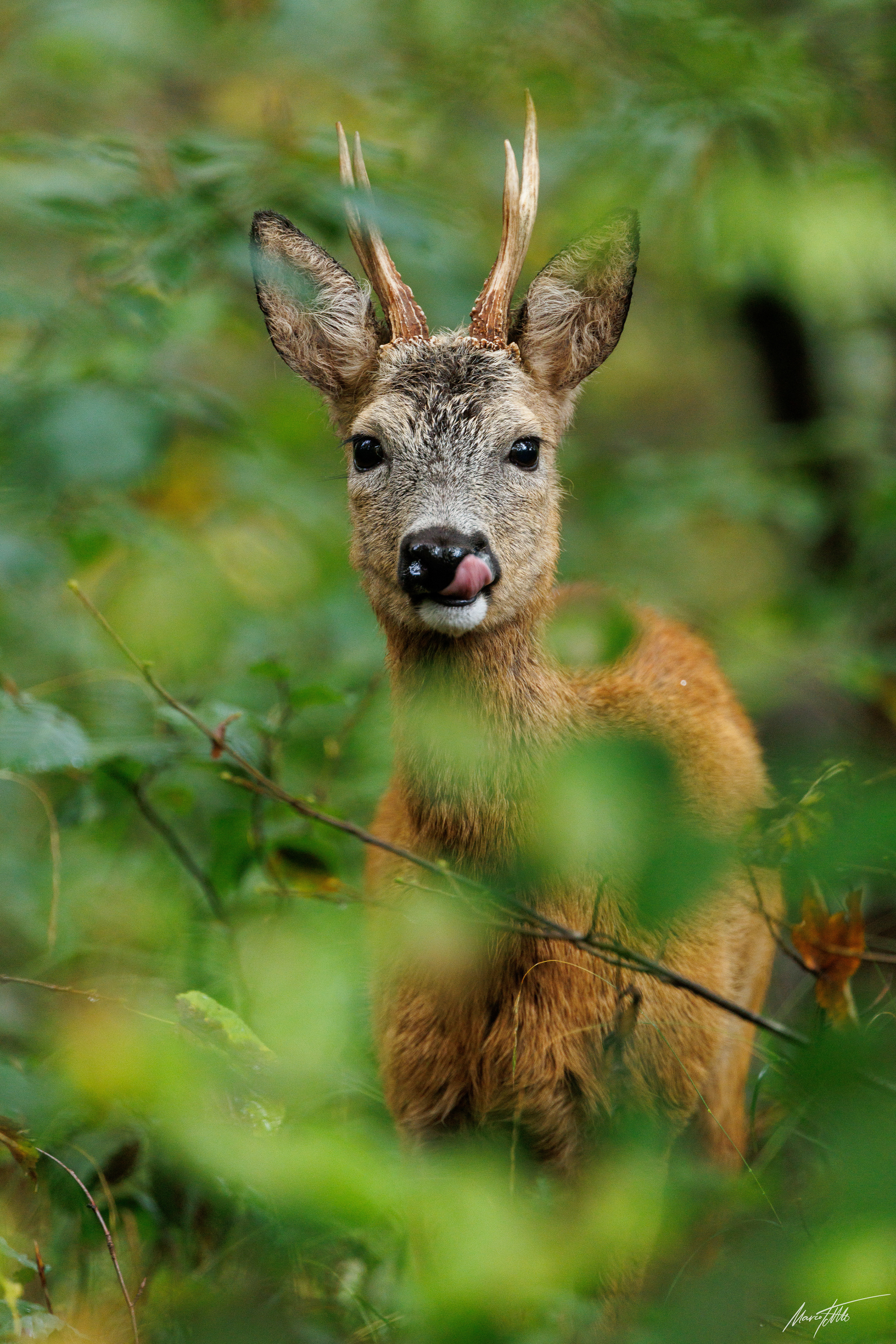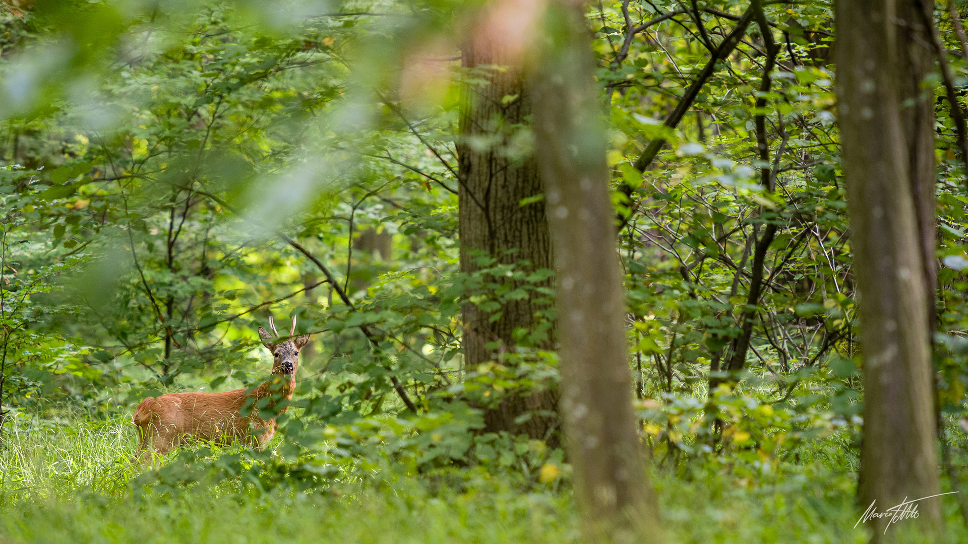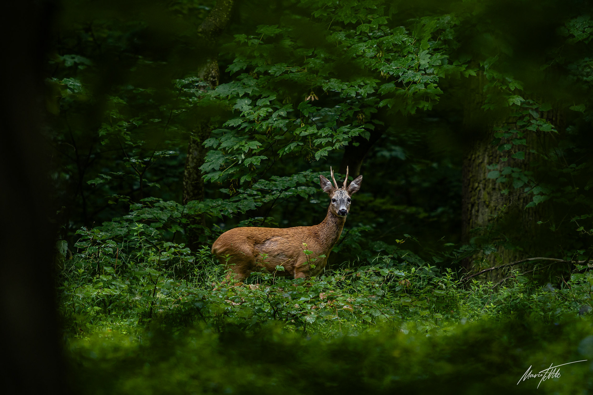 Alter und zurückgesetzter Rehbock markiert im grünen Unterholz sein Revier