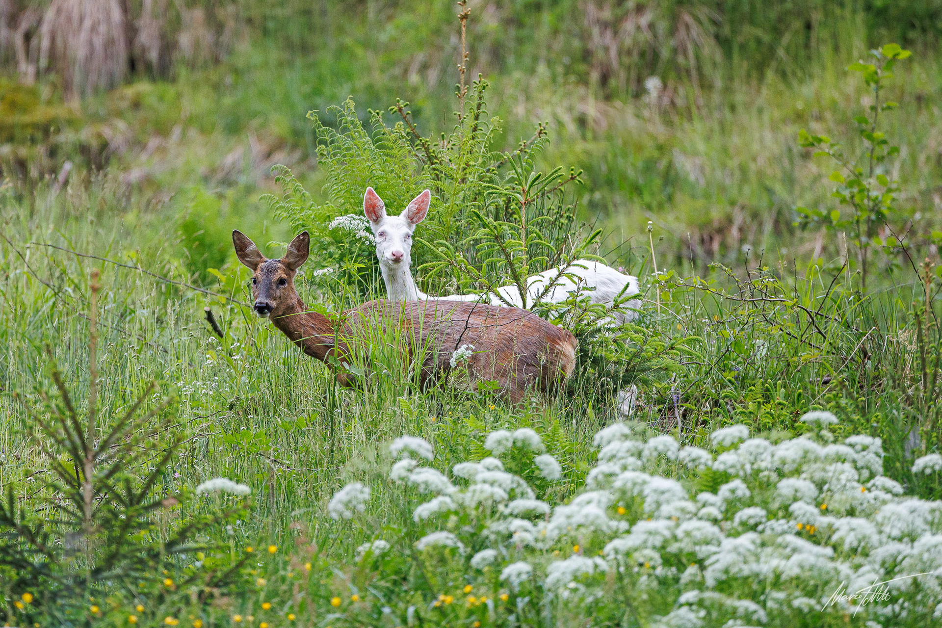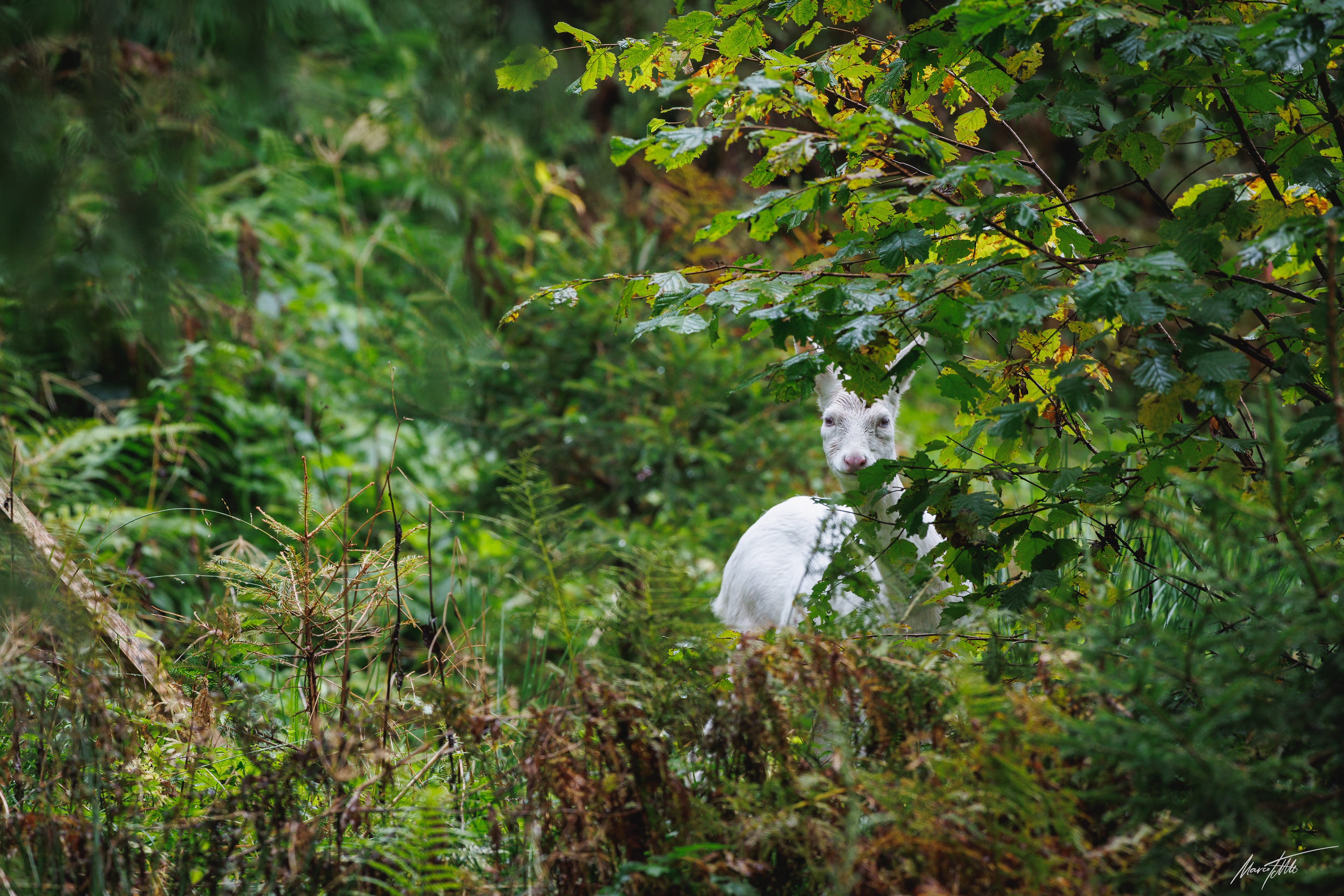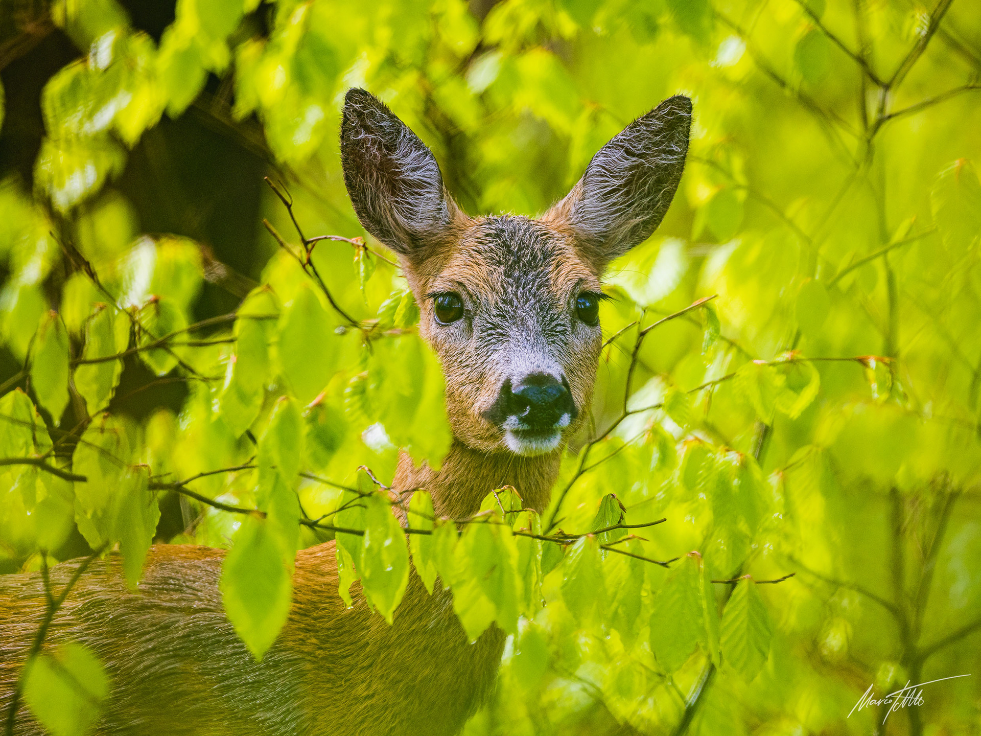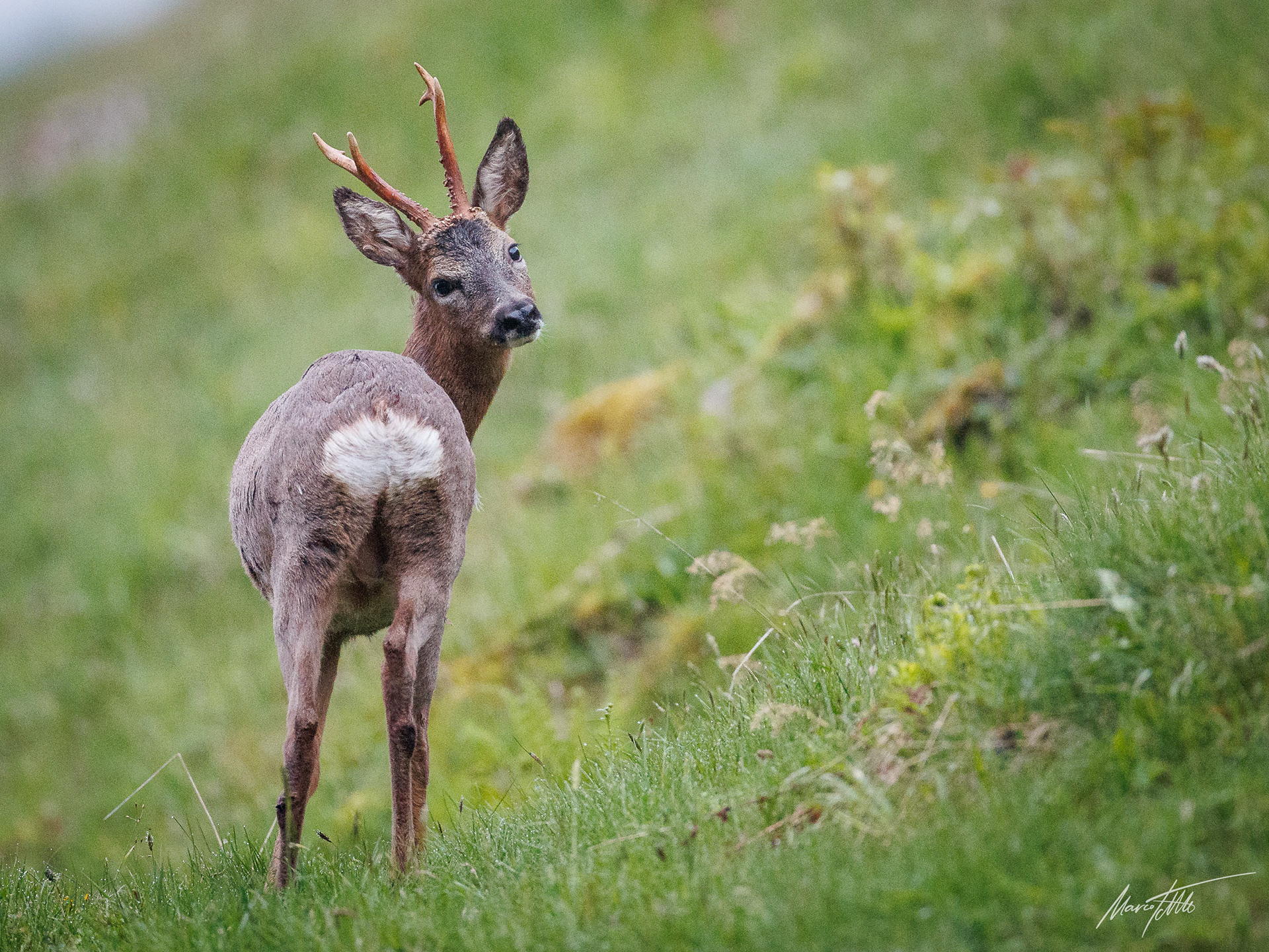 Alter und zurückgesetzter Rehbock markiert im grünen Unterholz sein Revier