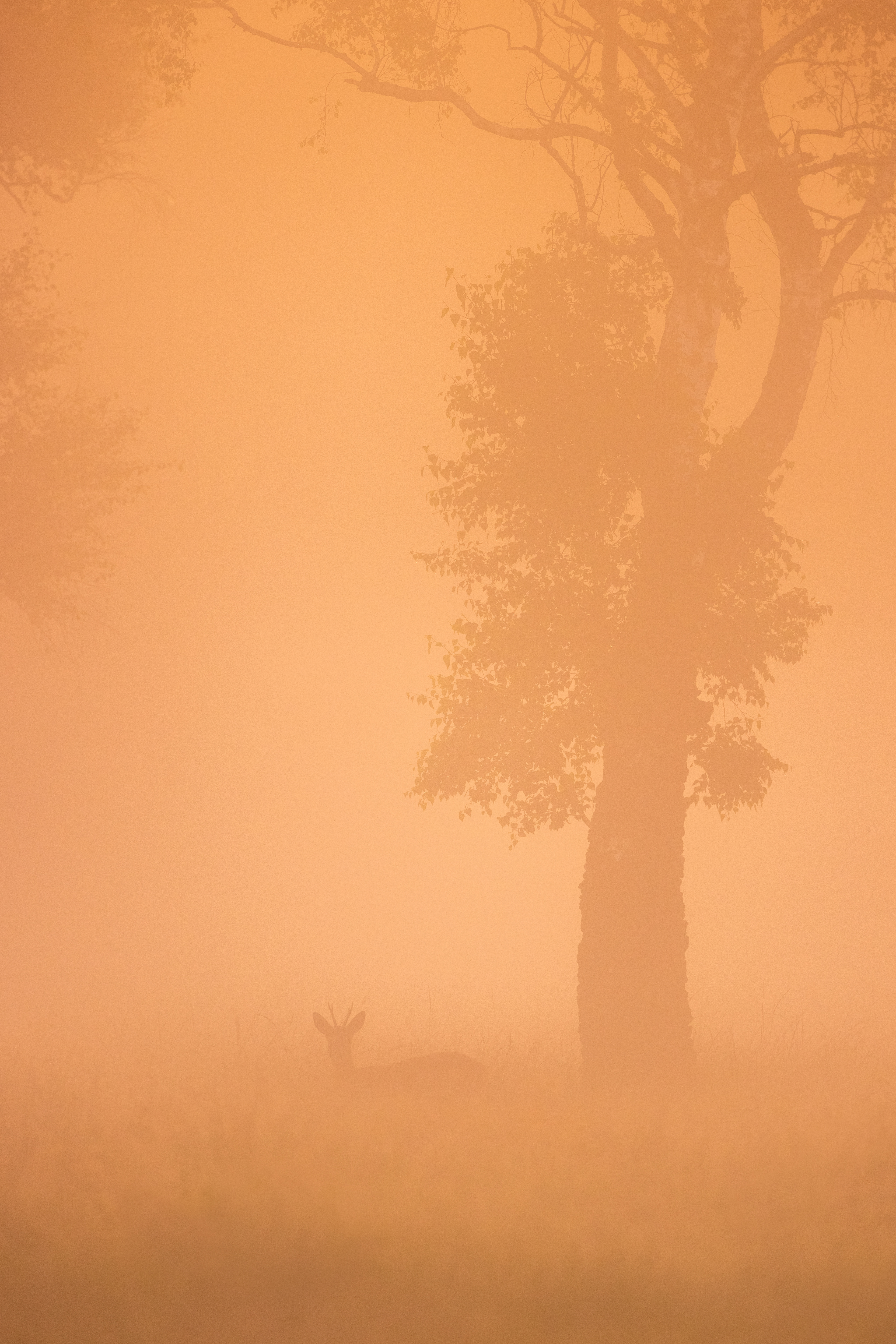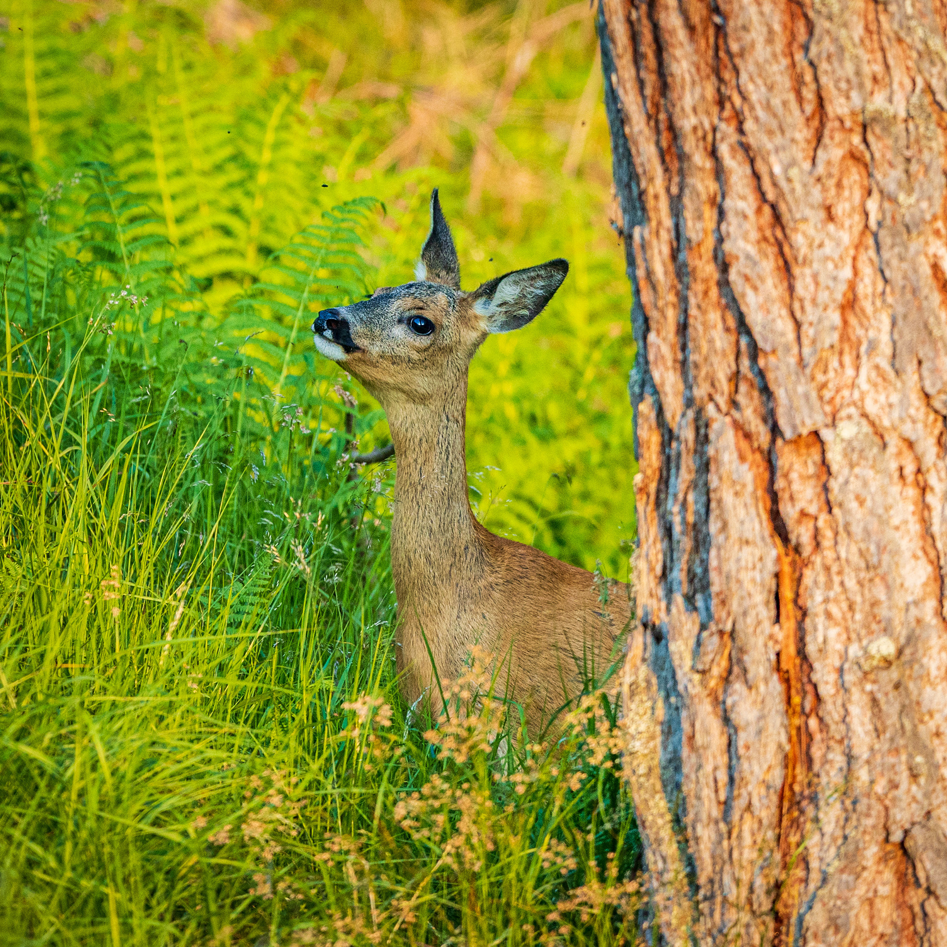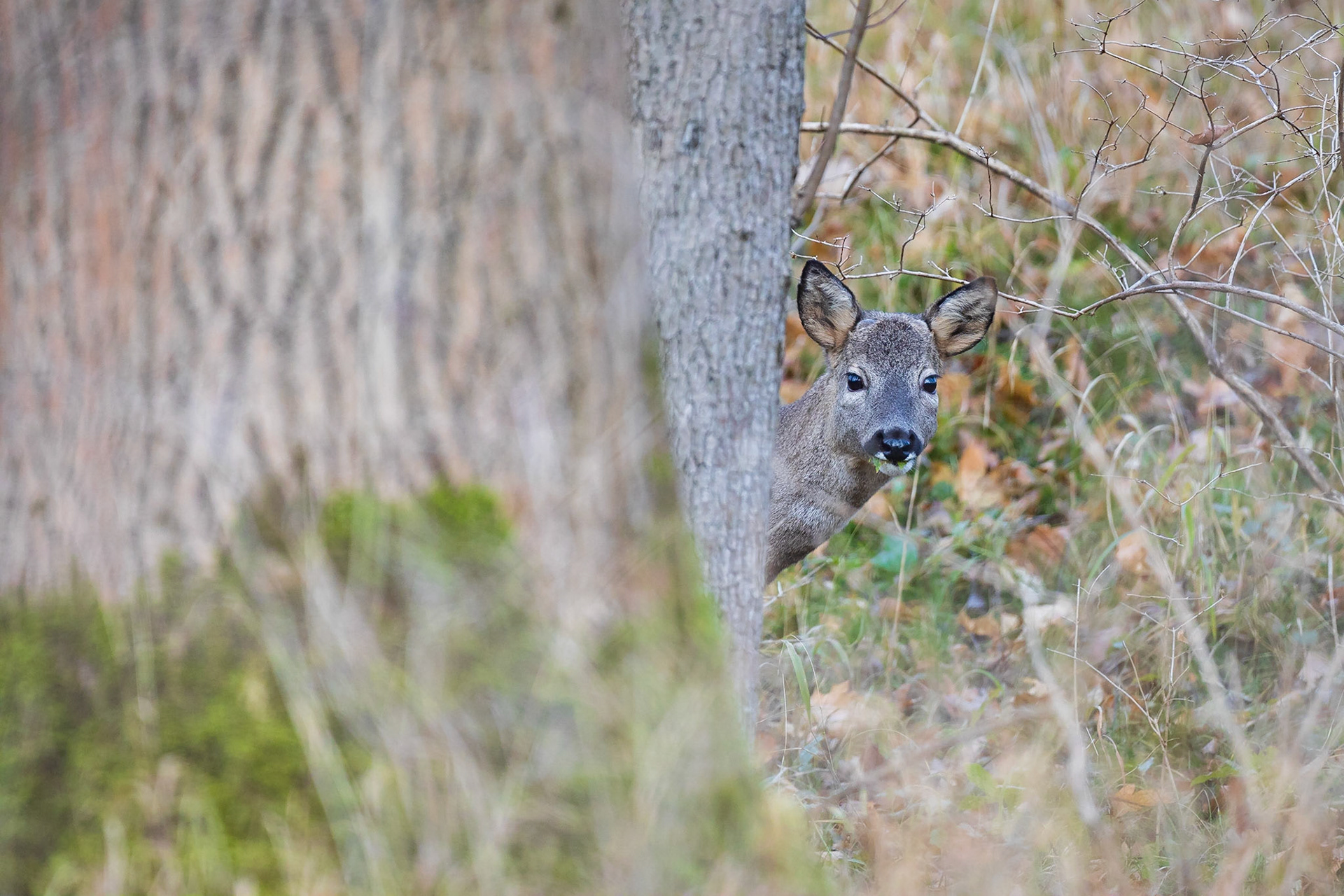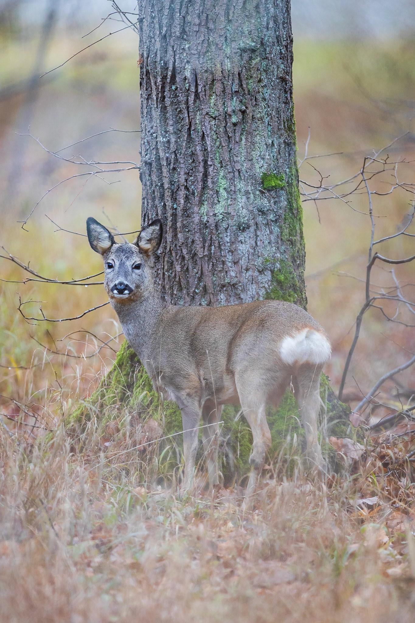 Ricke sichert hinter einem Laubbaum hervor