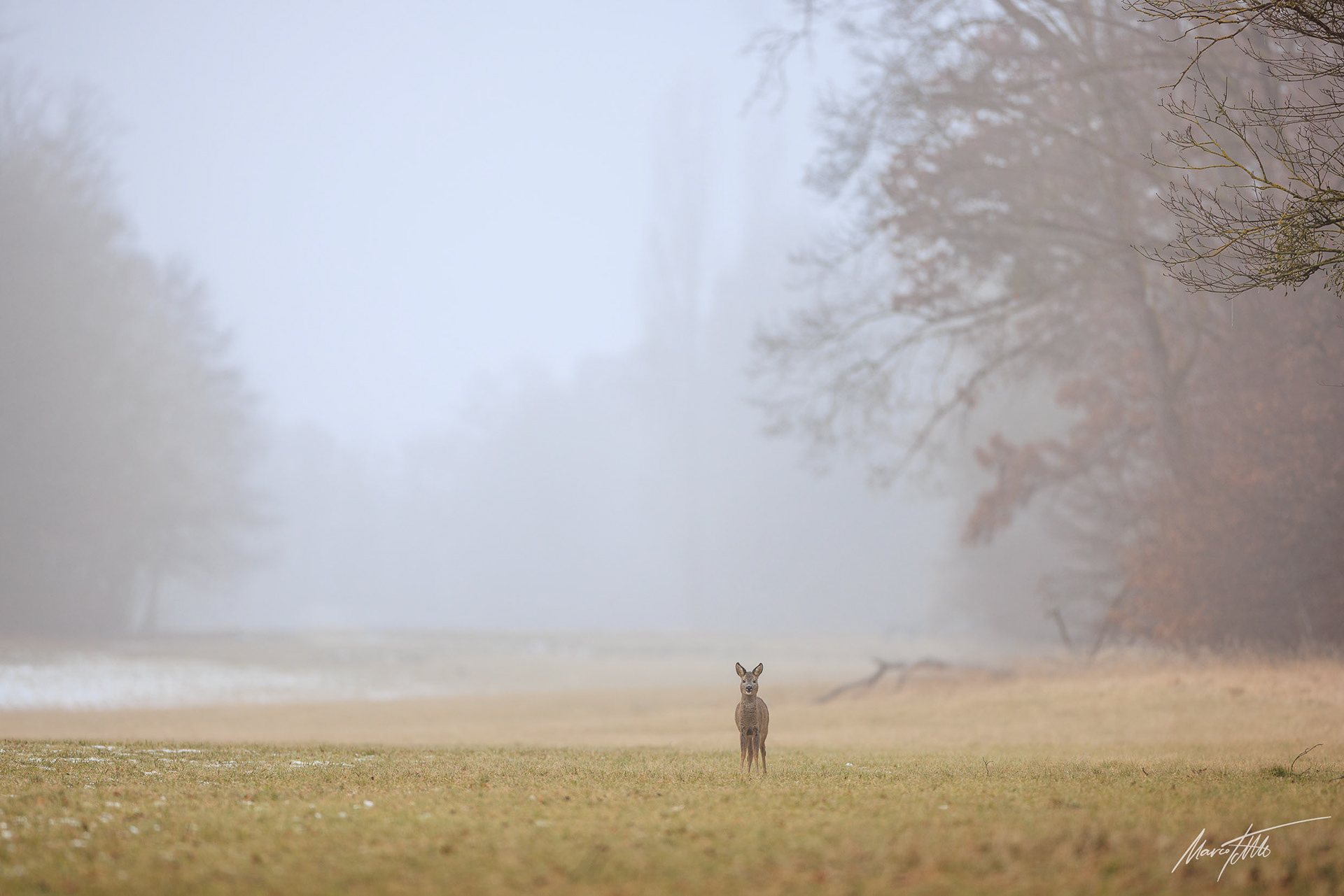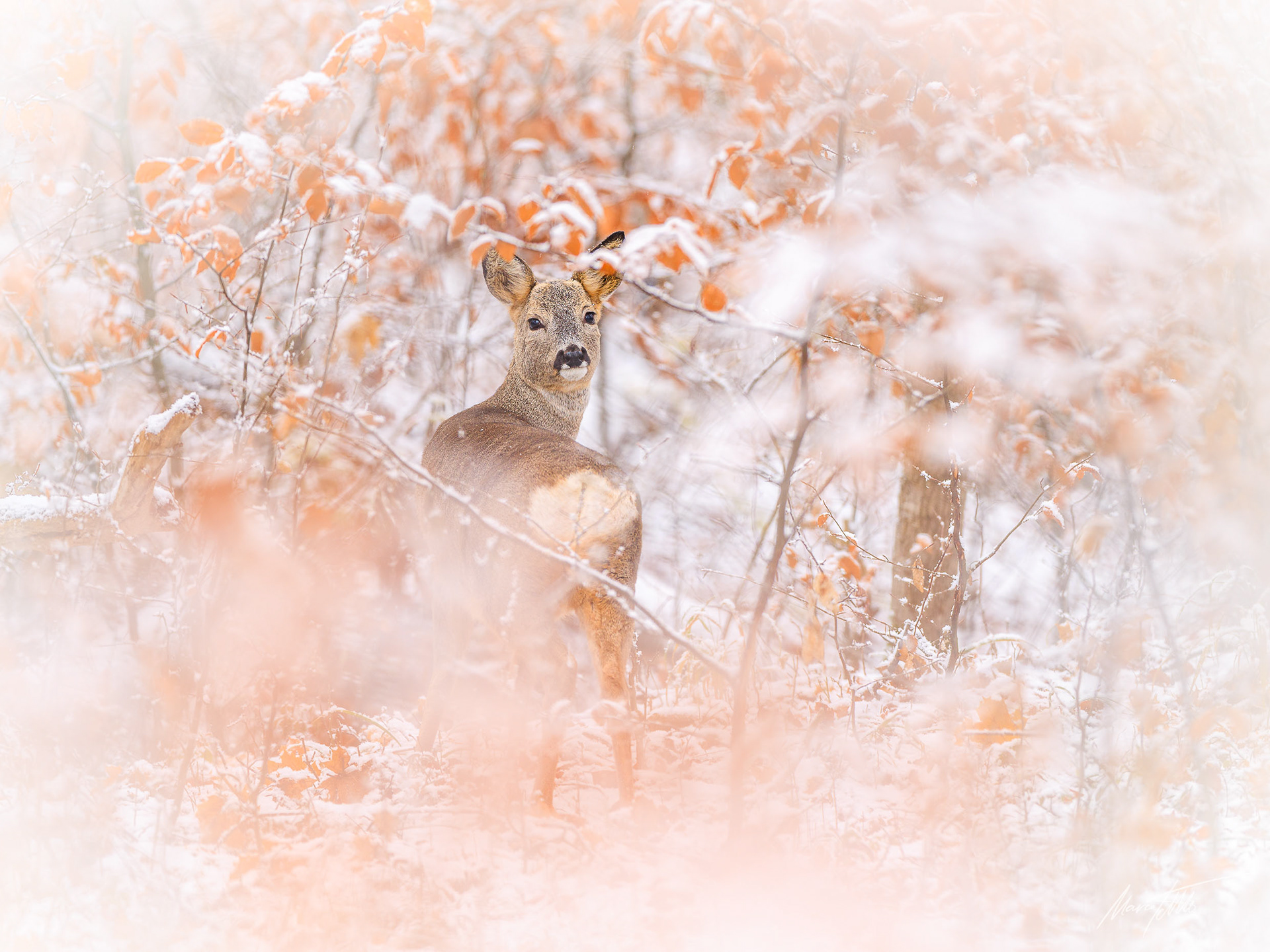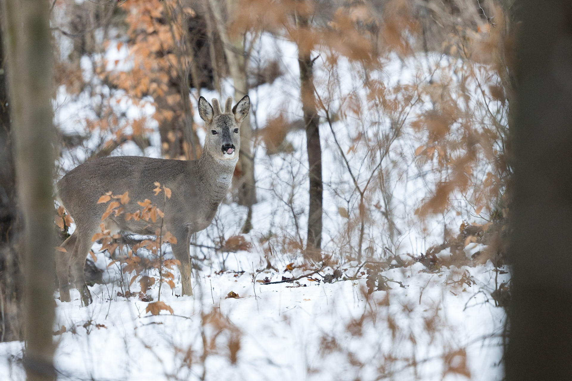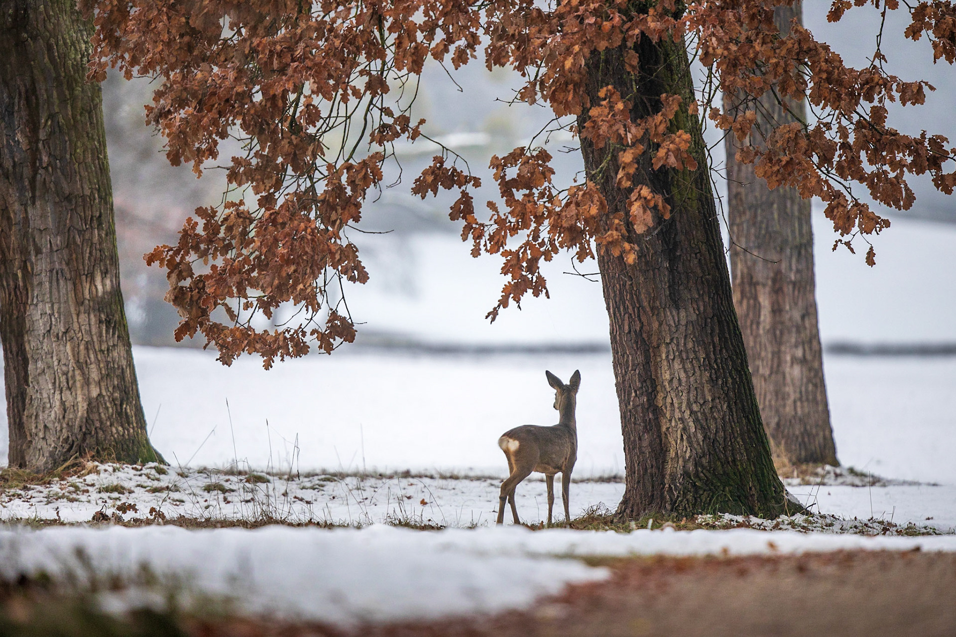 Ein weibliches Kitz bei leichtem Schneefall in offenem schneebedecktem Laubwald