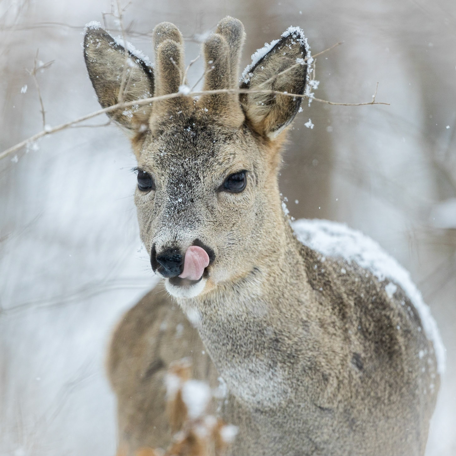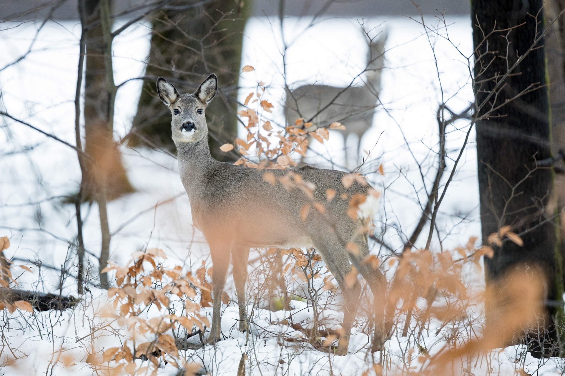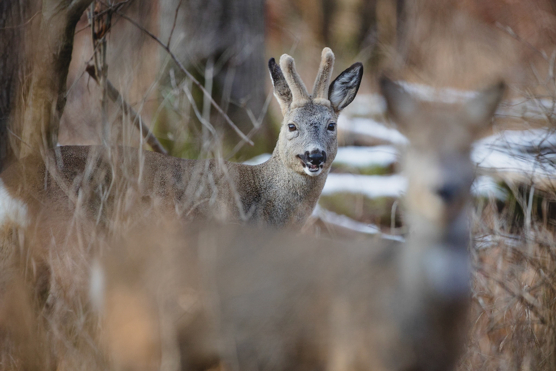 Doppelt Lauscher hoher Rehbock im Bast im tief verschneiten Winterwald