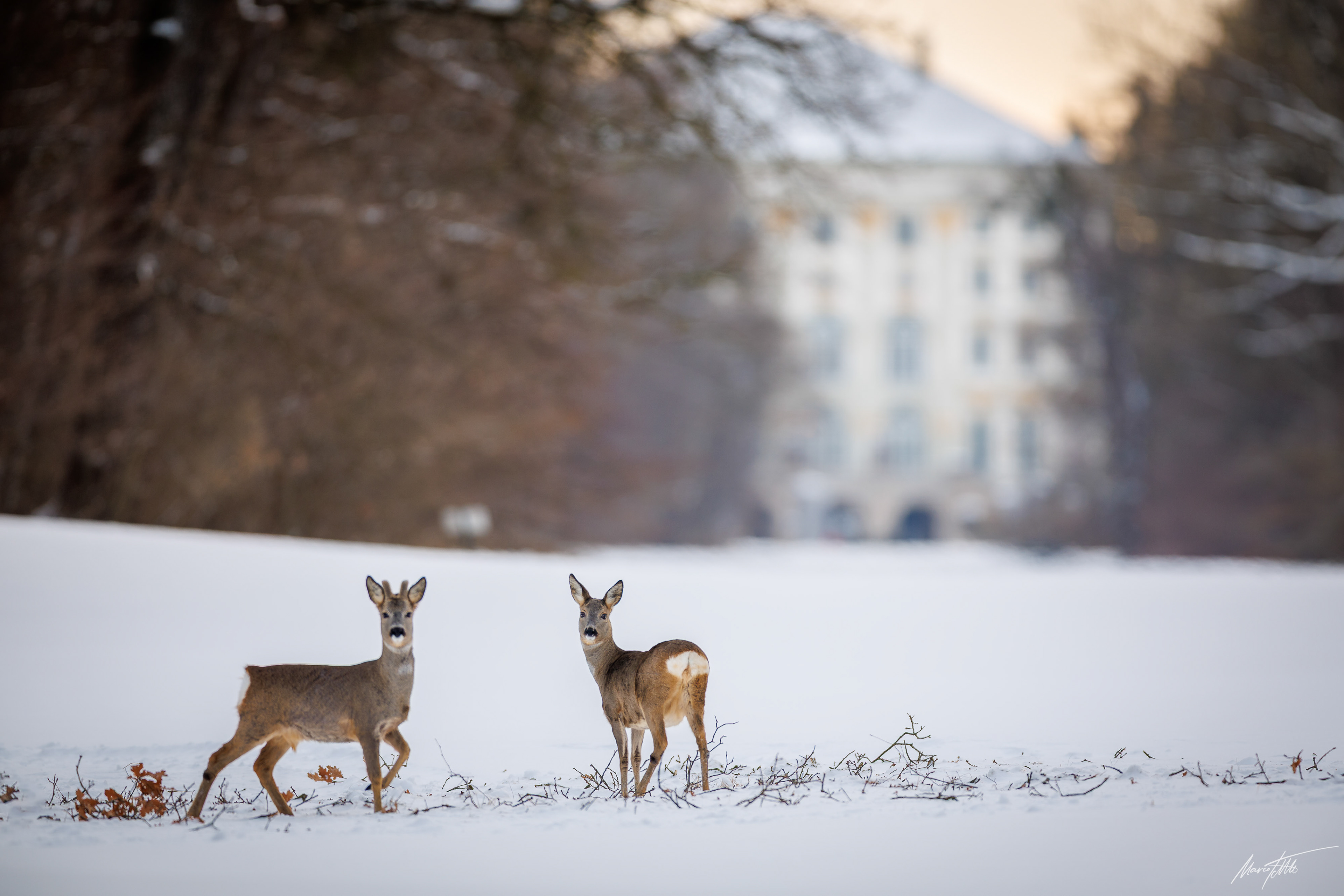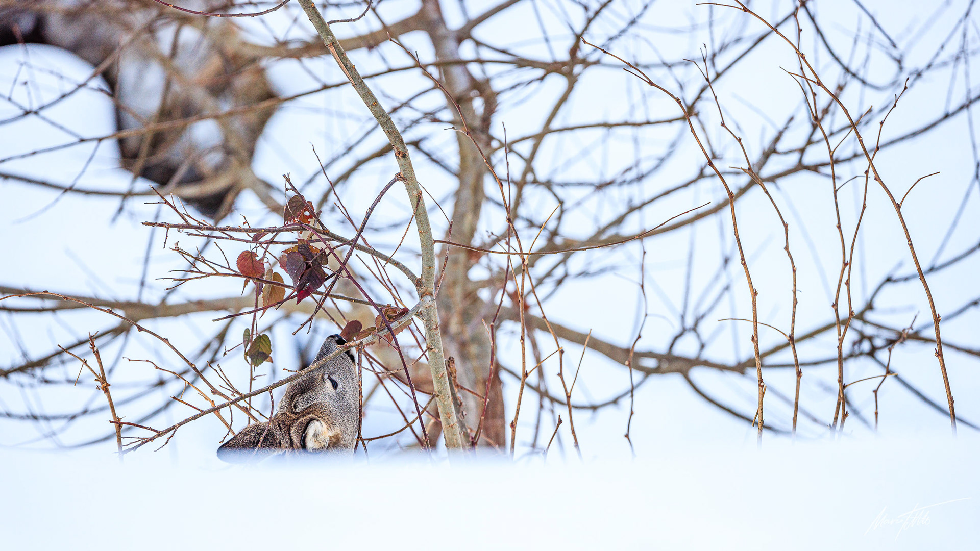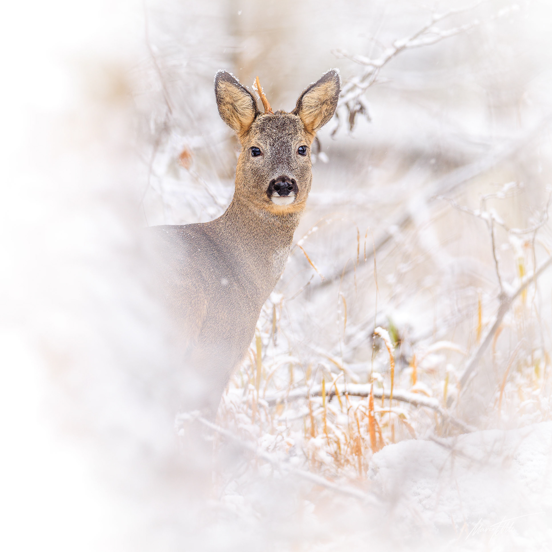 Doppelt Lauscher hoher Rehbock im Bast im tief verschneiten Winterwald