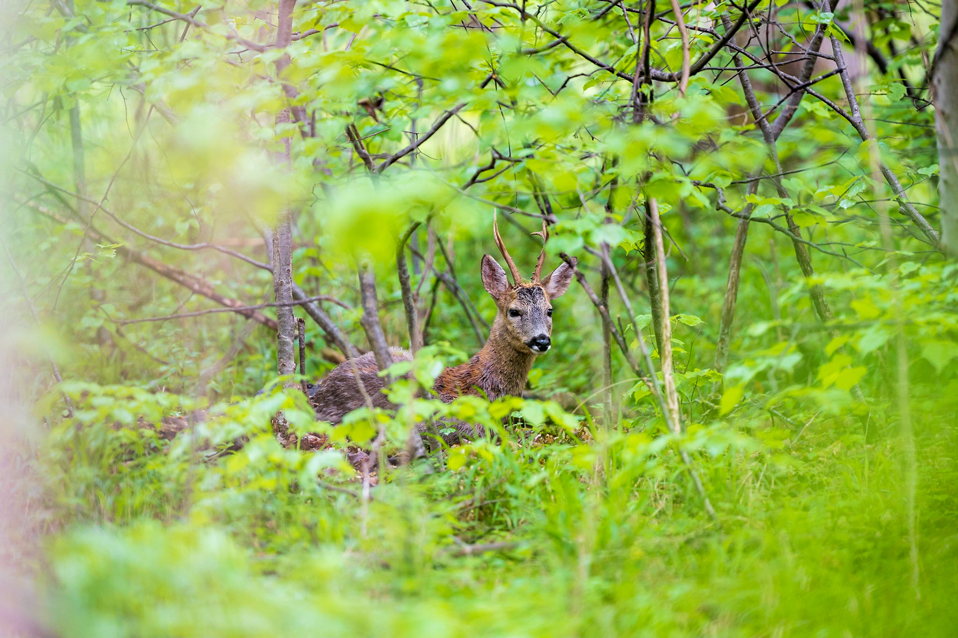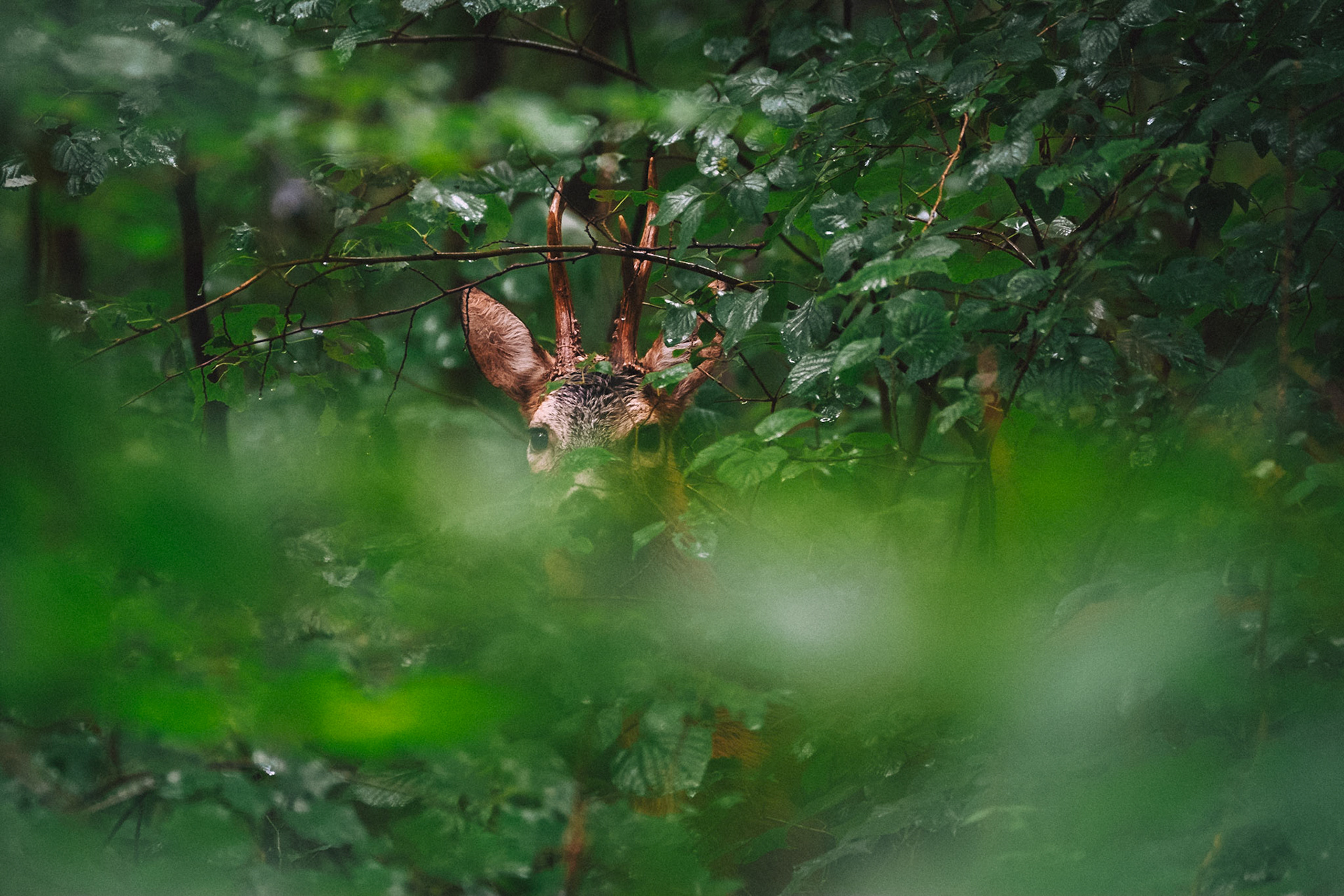 Rehbock im Bast verhofft in Unterholz im Regen