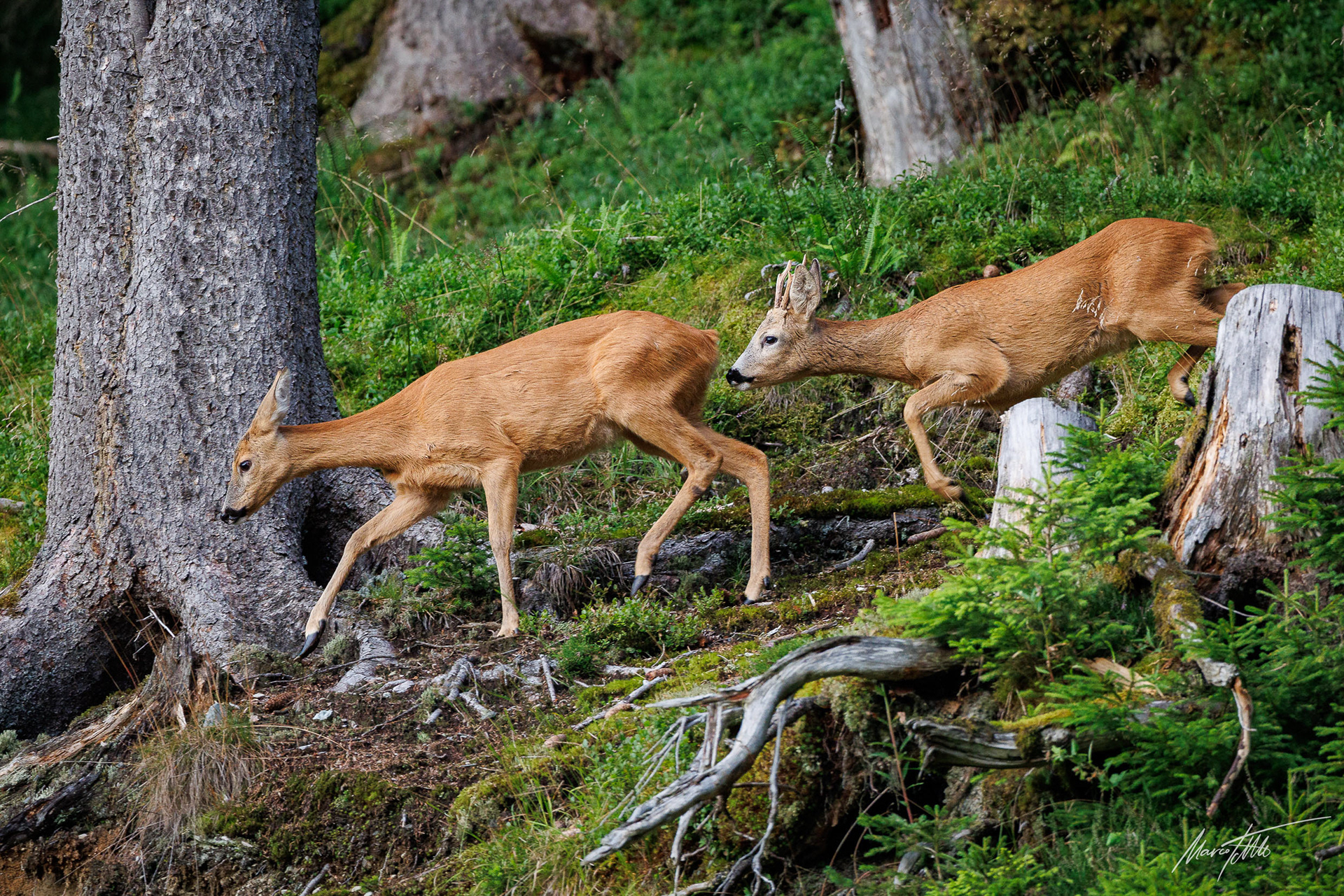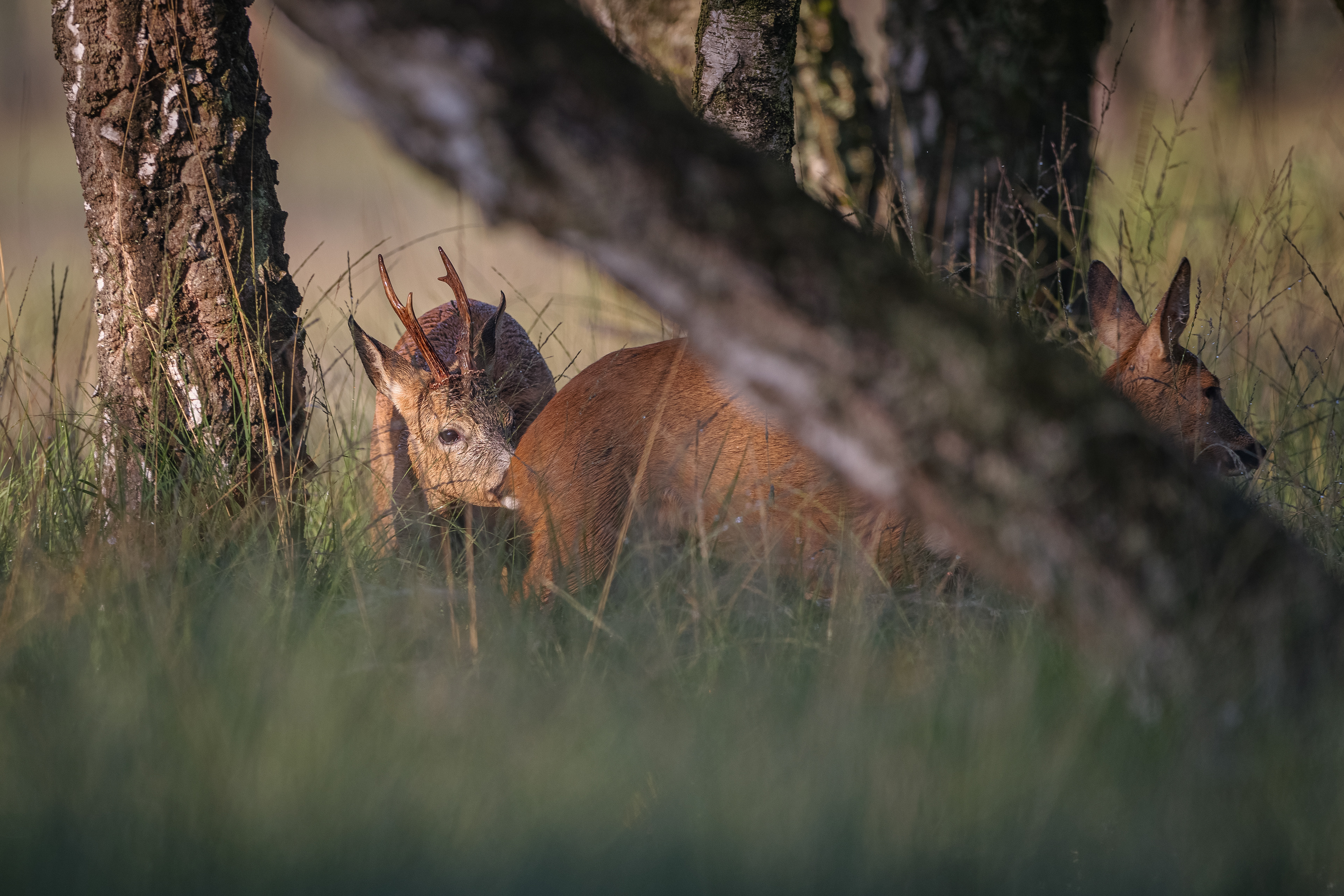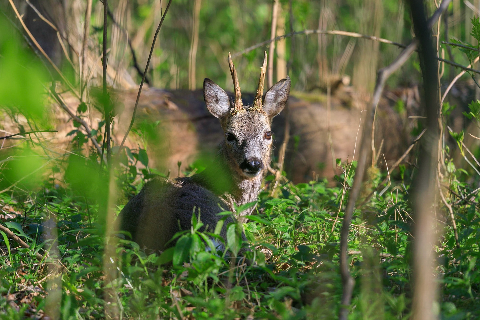 Frisch verfegter Rehbock sichert im Altholz mit herumliegenden Totholz - Ricke ruht daneben