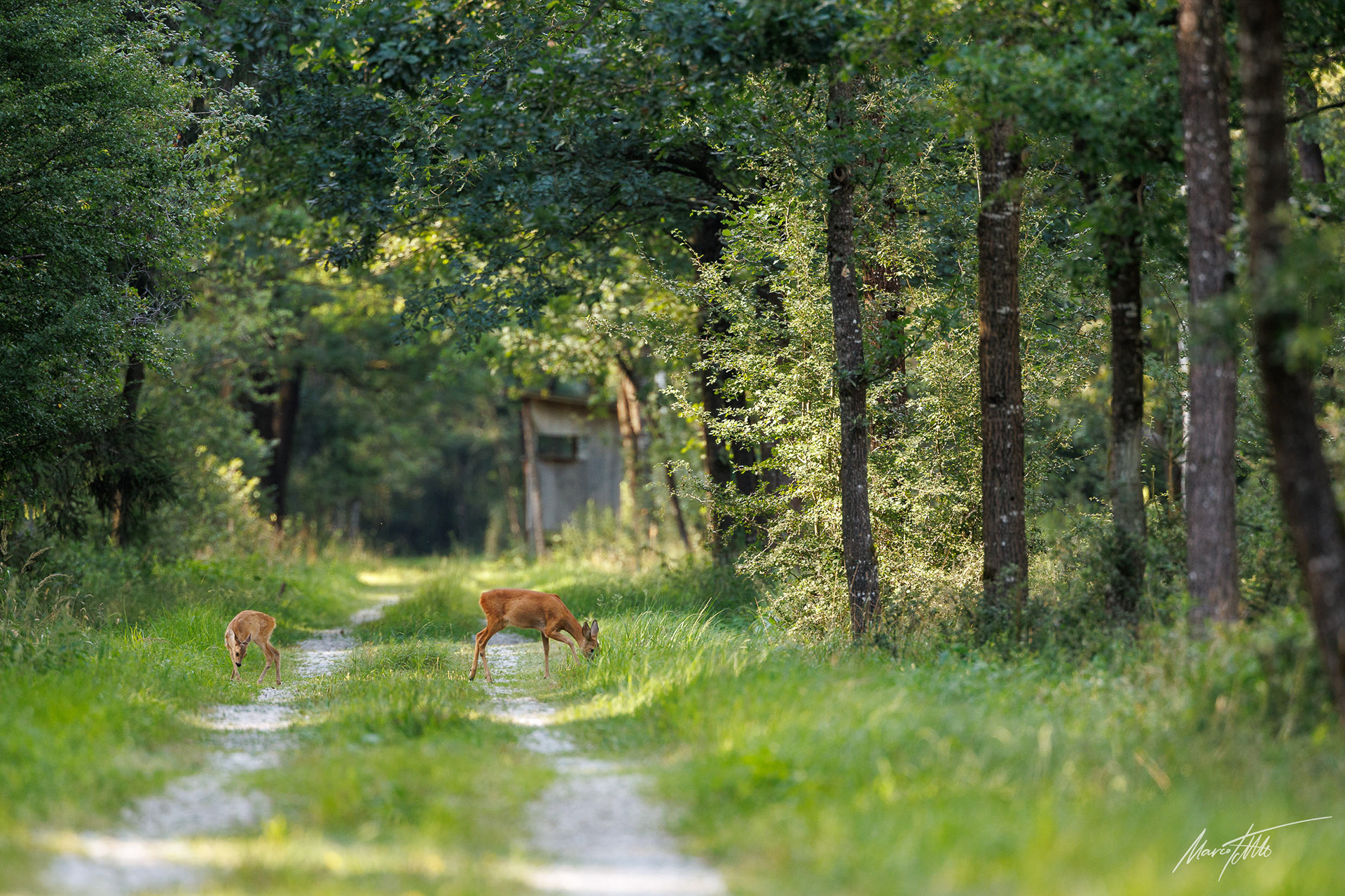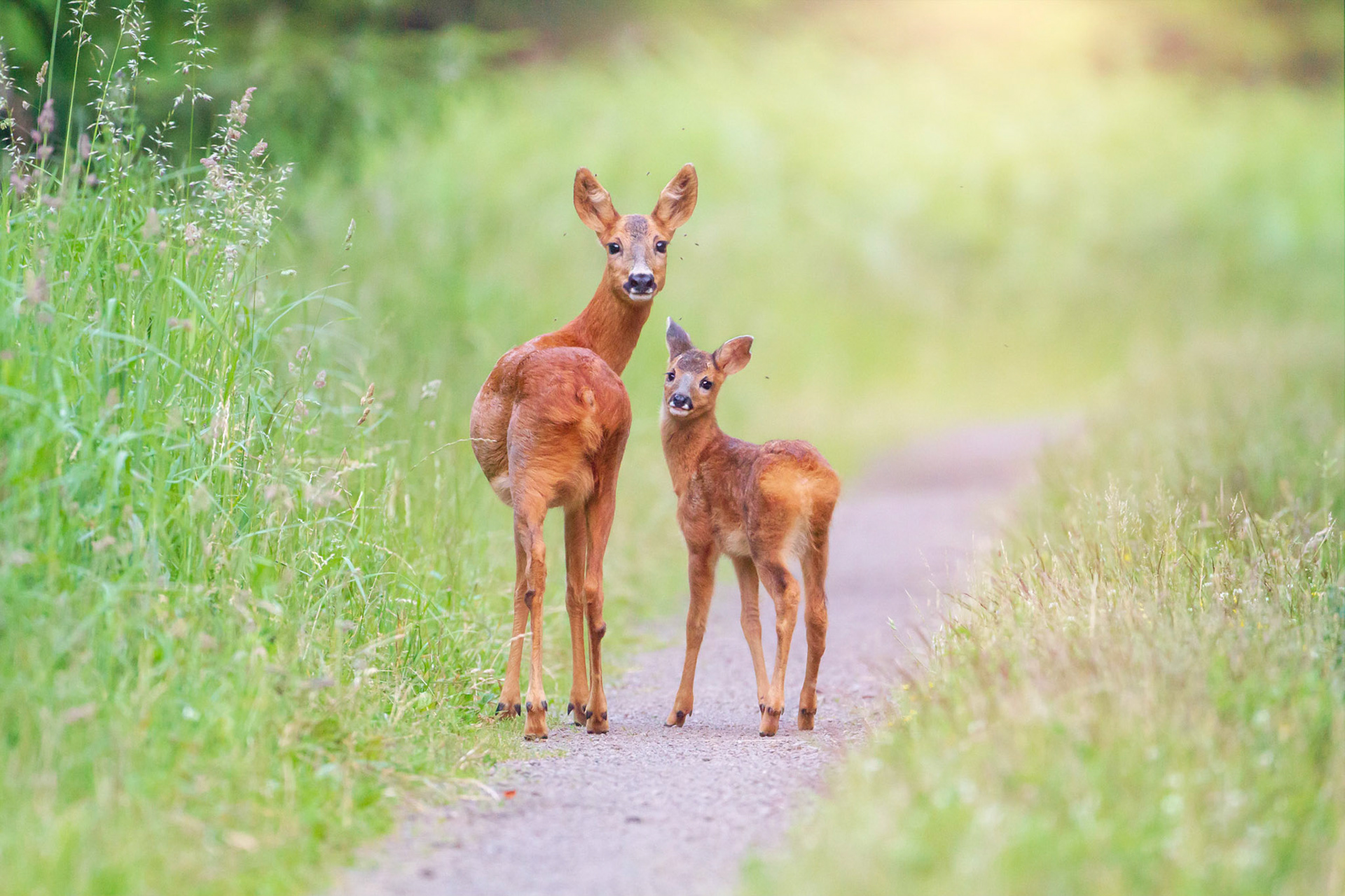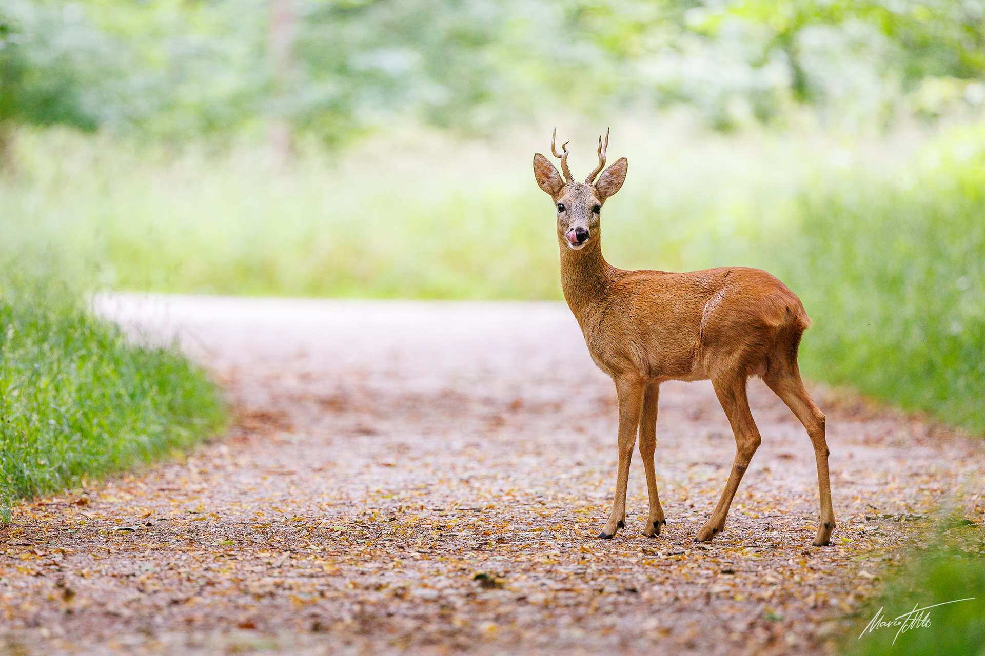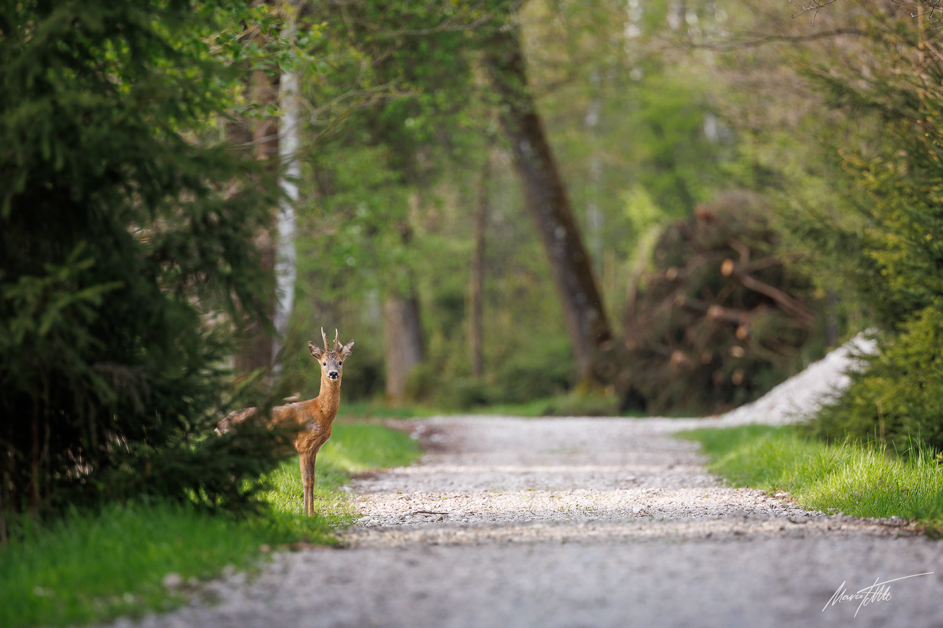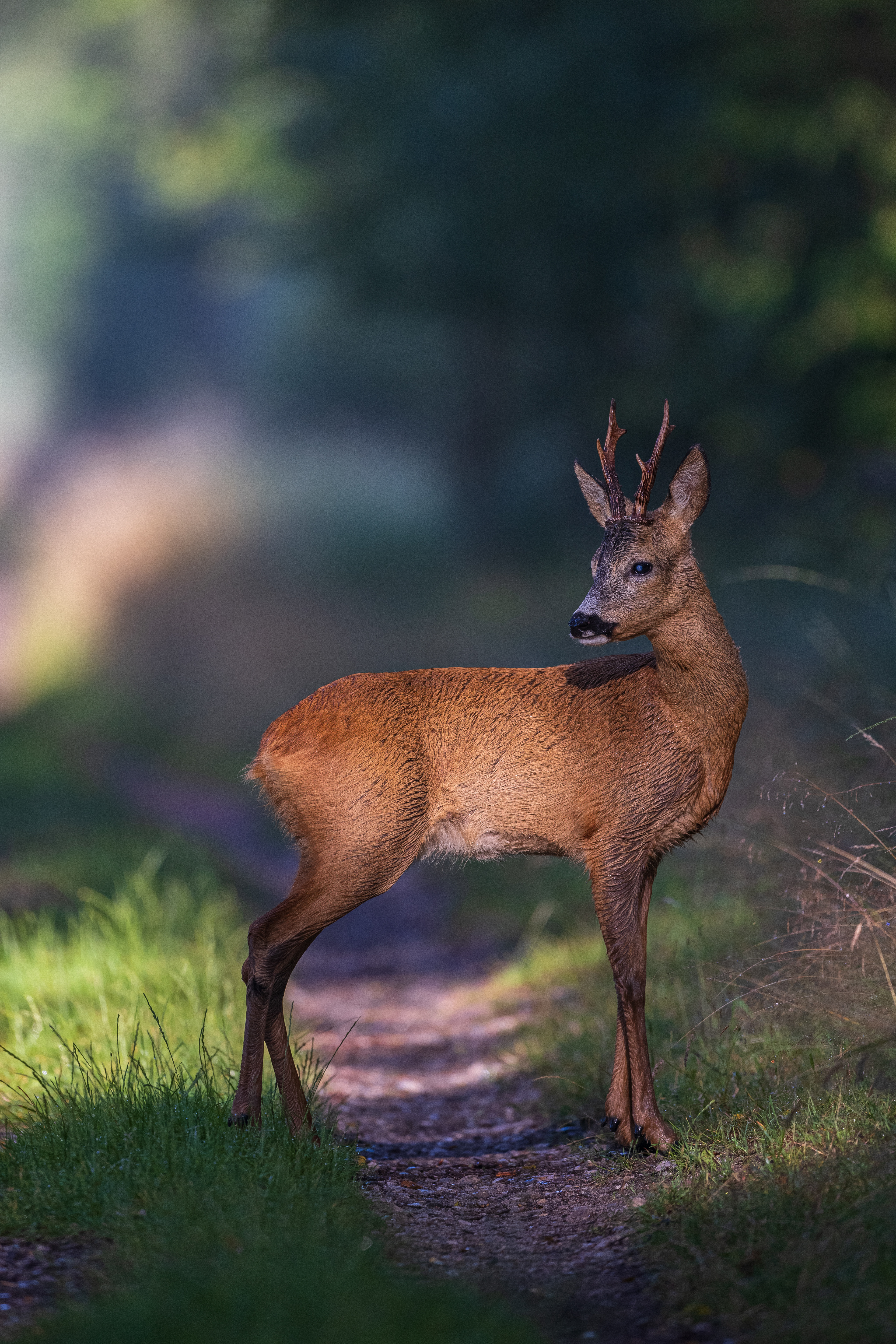 Mittelalter 6er-Bock im Bast sichert rückwärts auf Forstweg in Richtung einer äsenden Ricke im Vordergrund