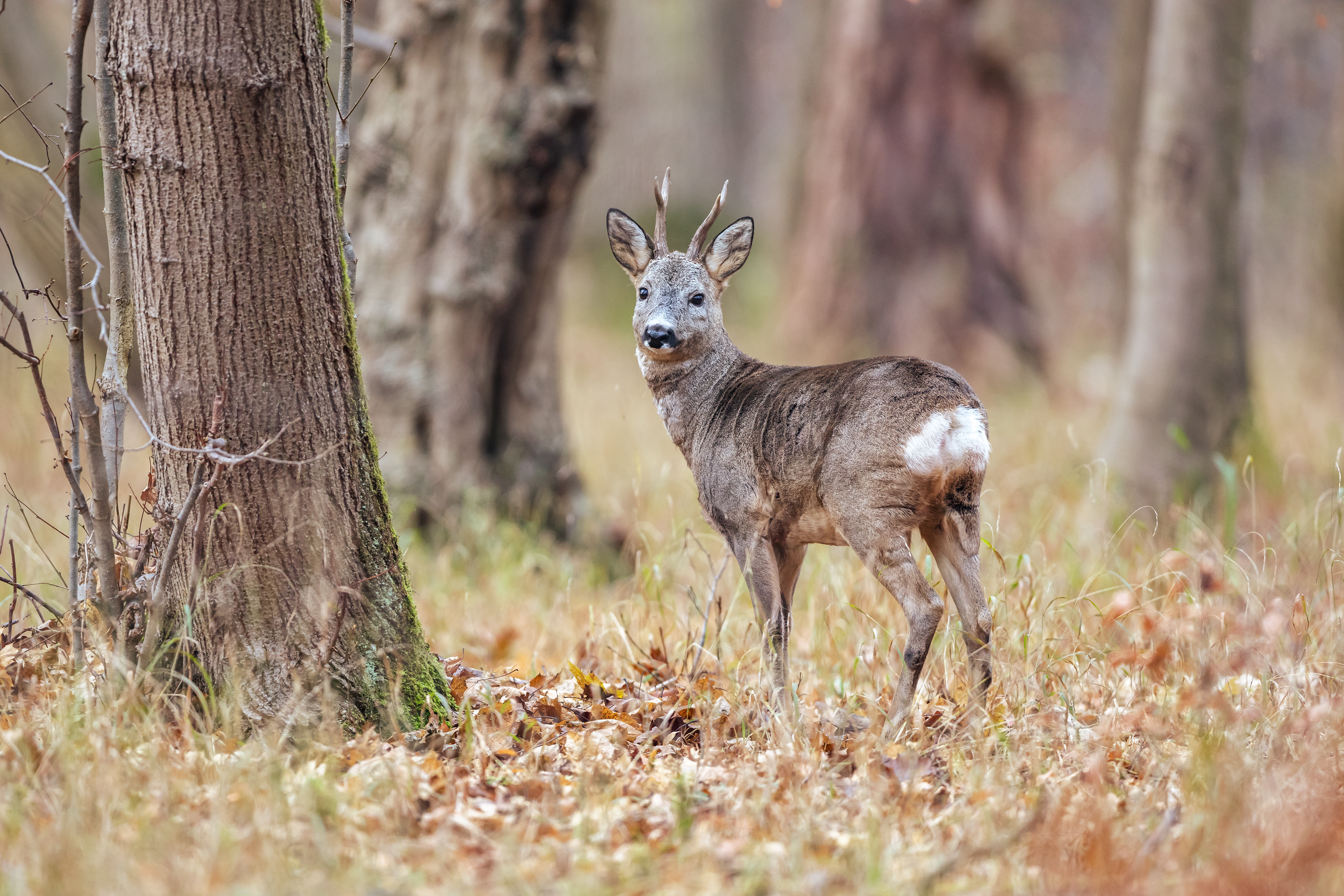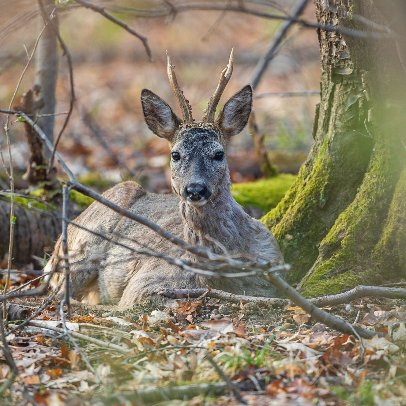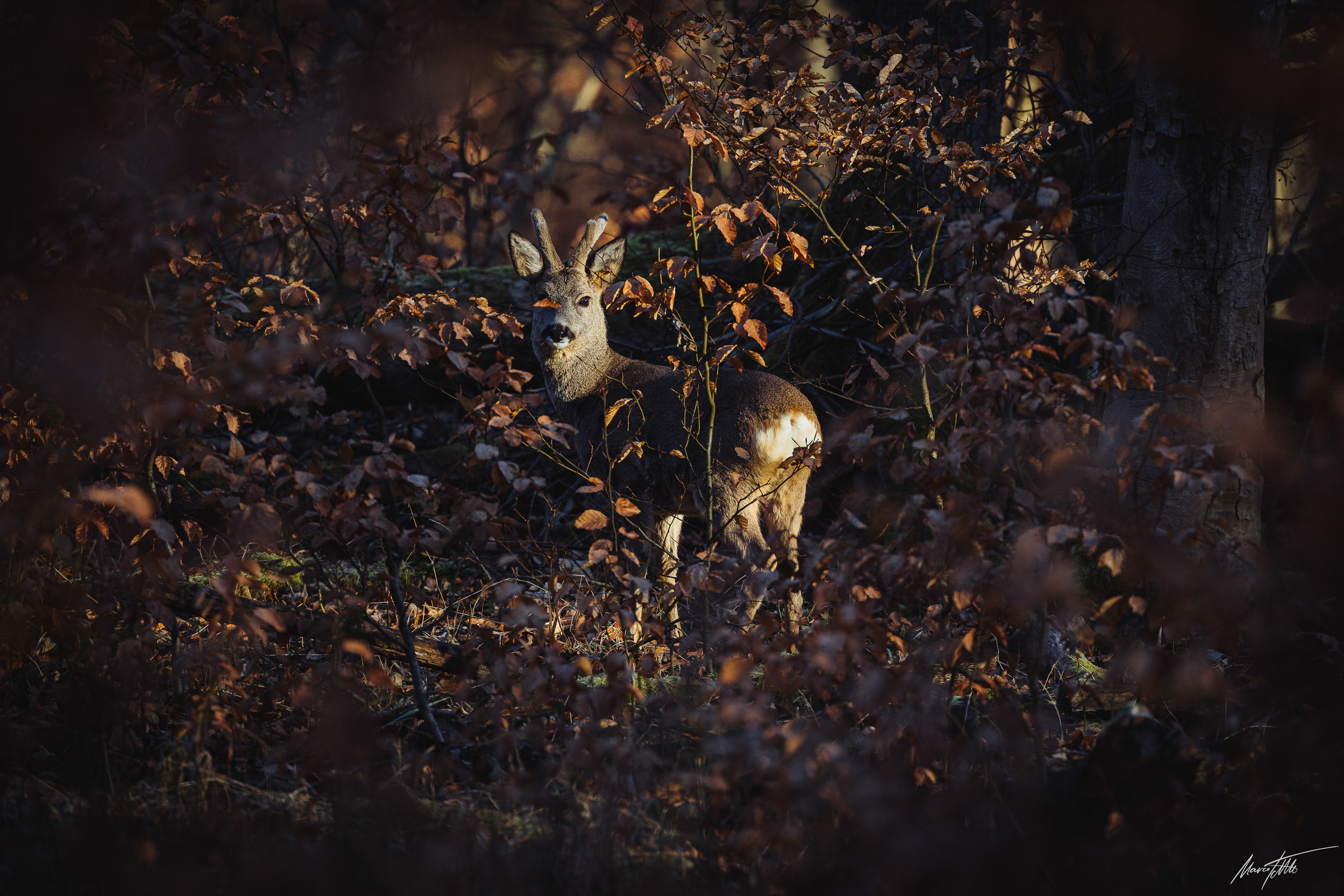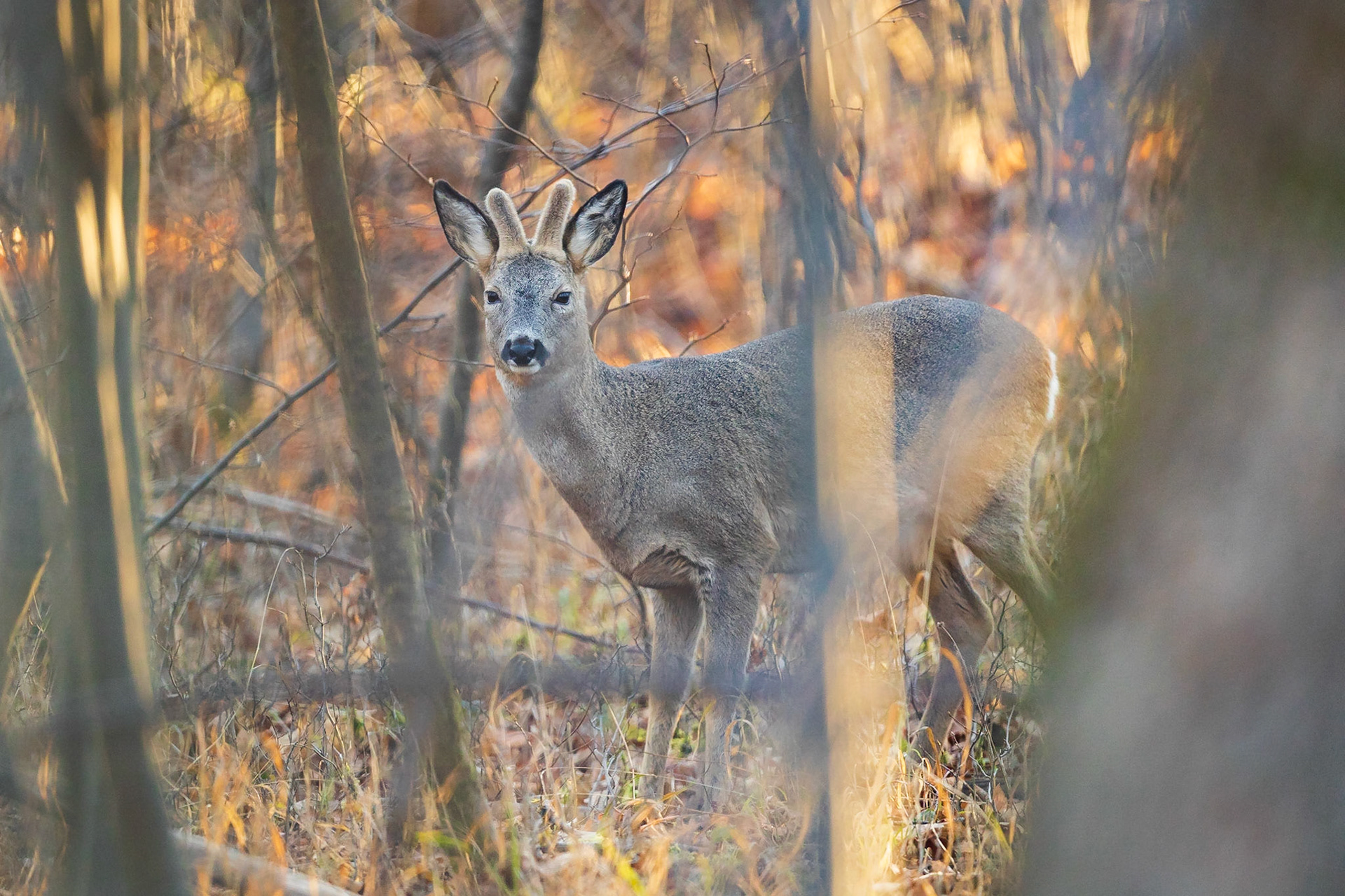 Ein mittelalter Rehbock im Bast inmitten von braun verfärbtem Buchenrauschen