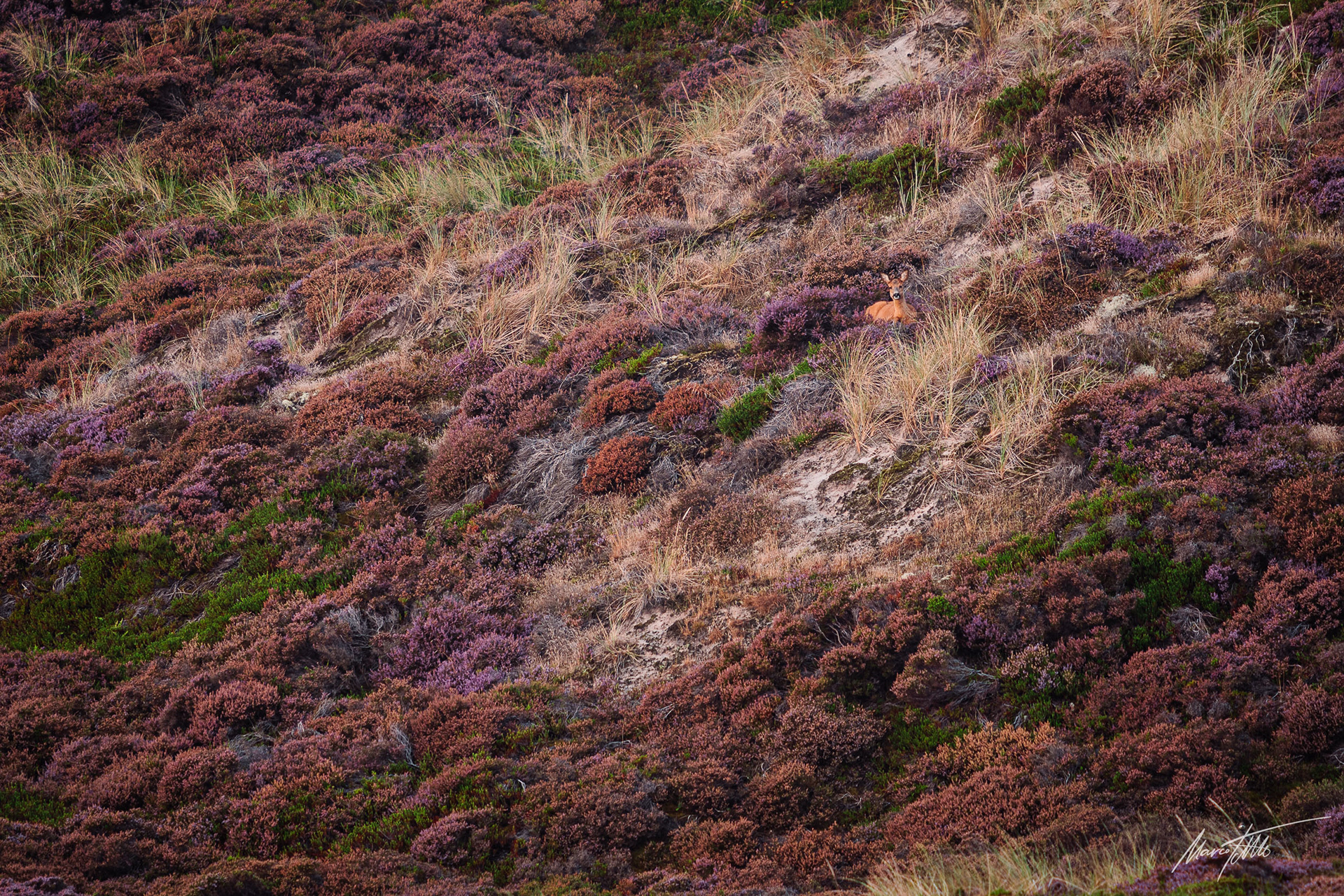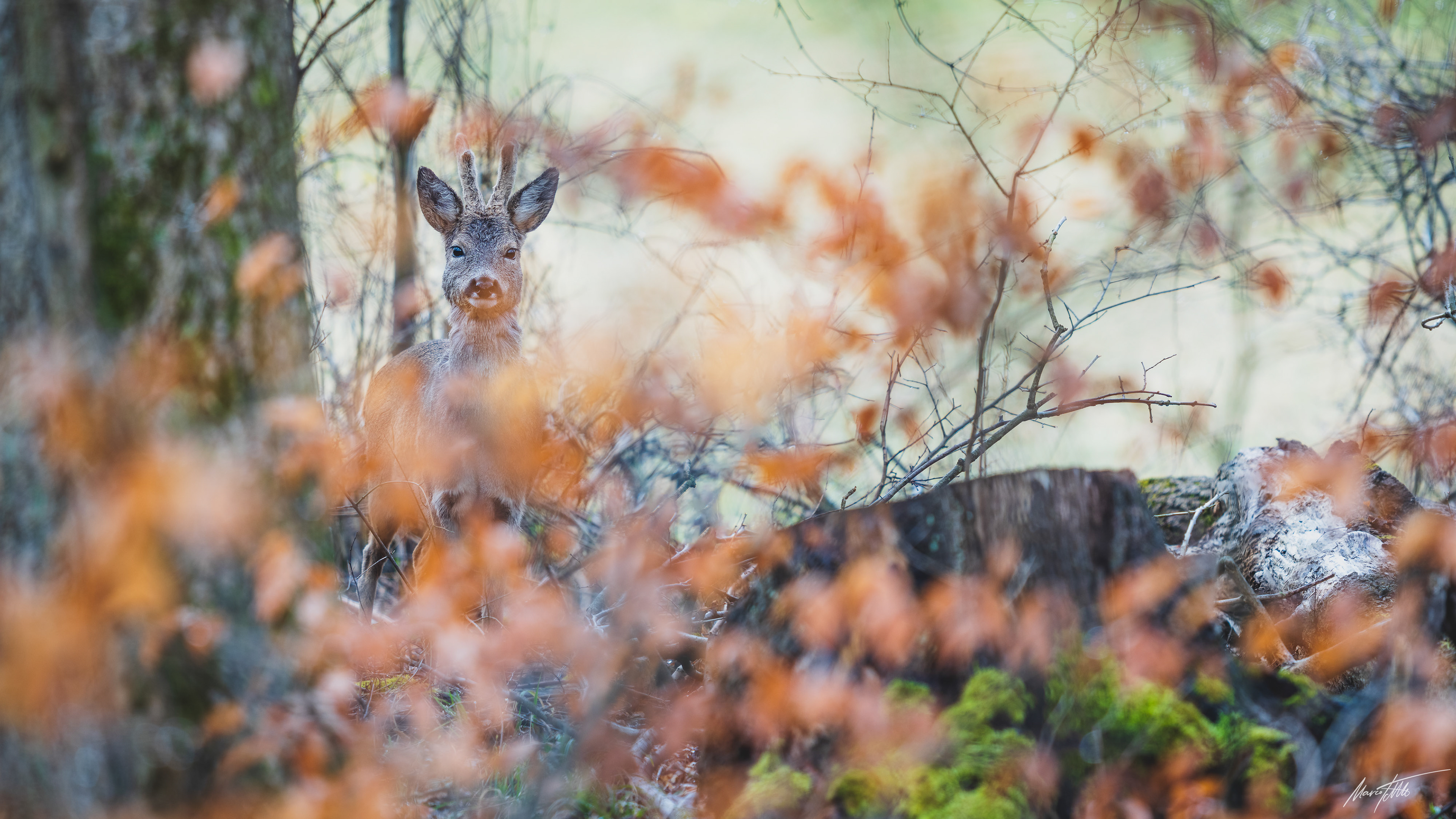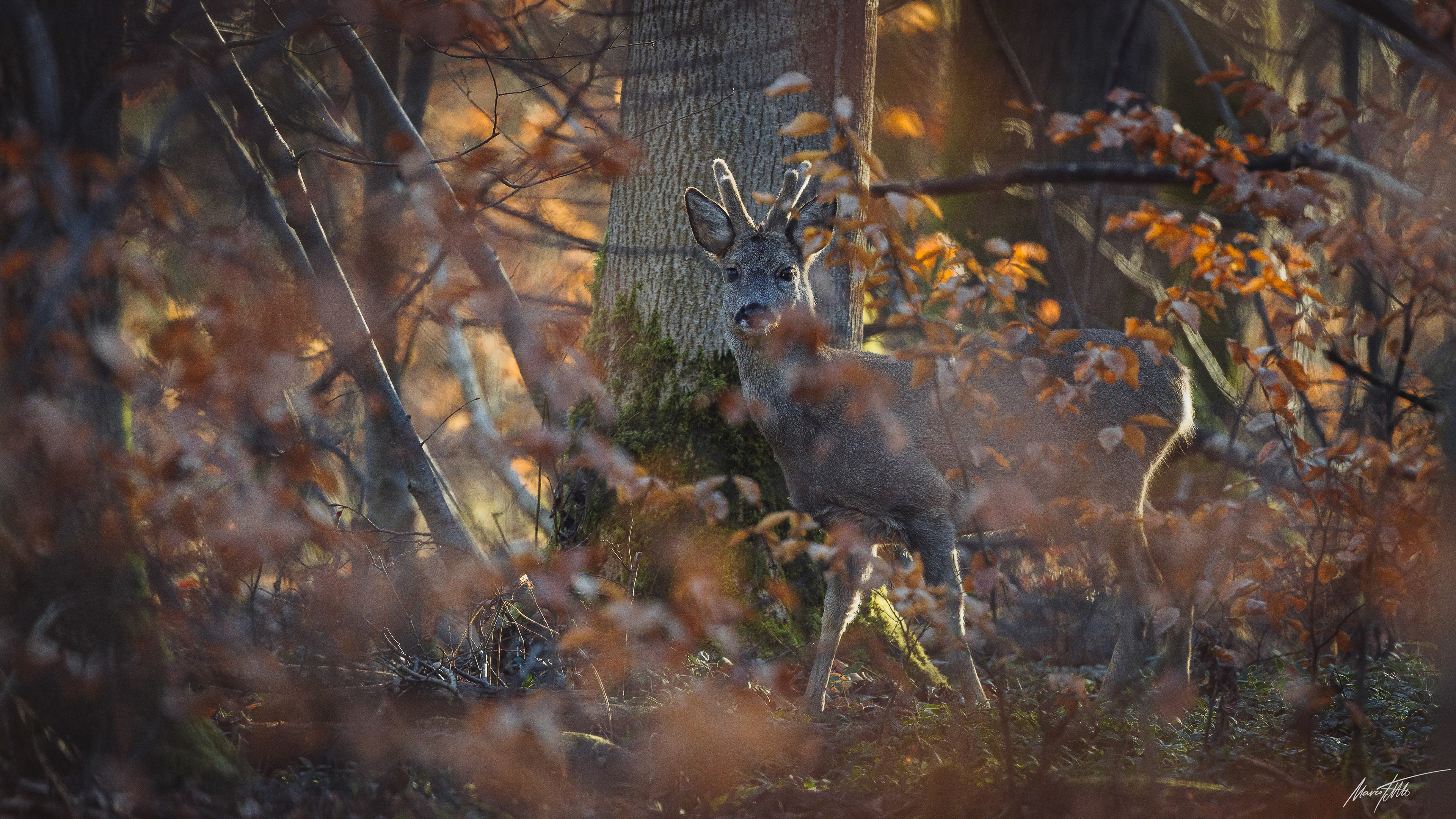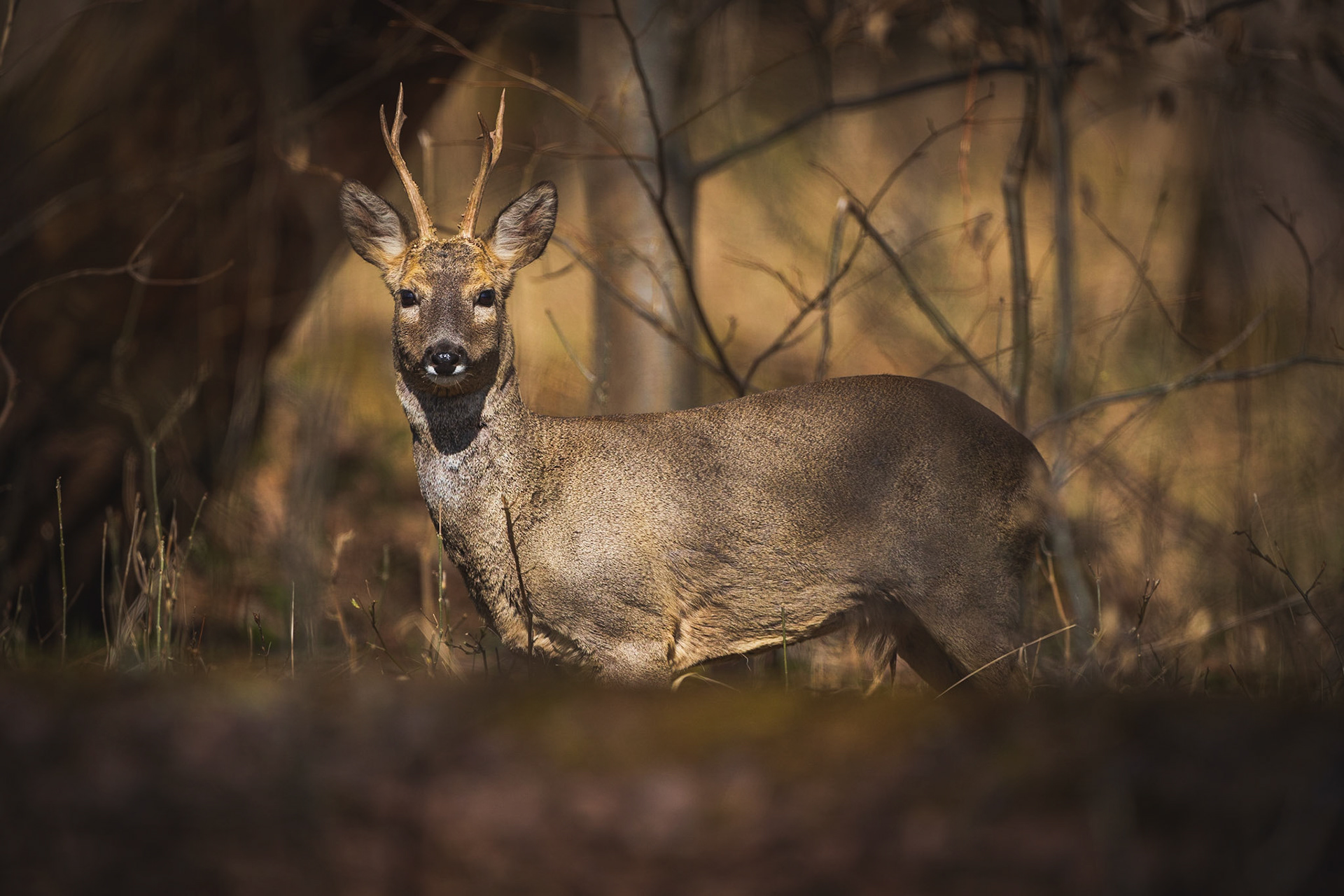 Ein mittelalter Rehbock im Bast inmitten von braun verfärbtem Buchenrauschen