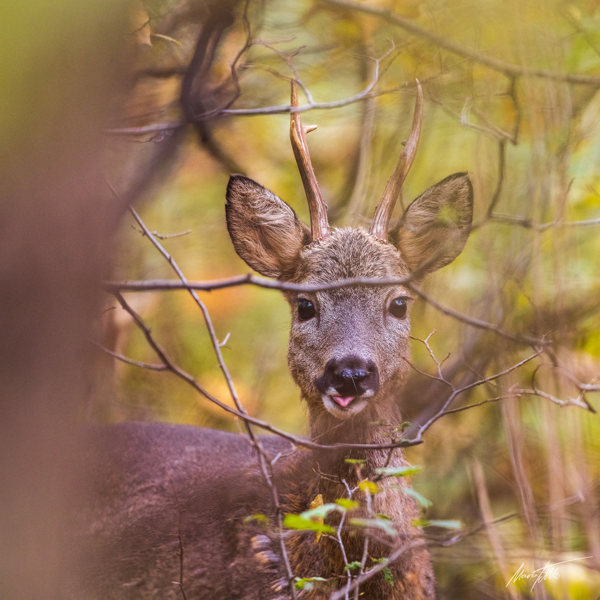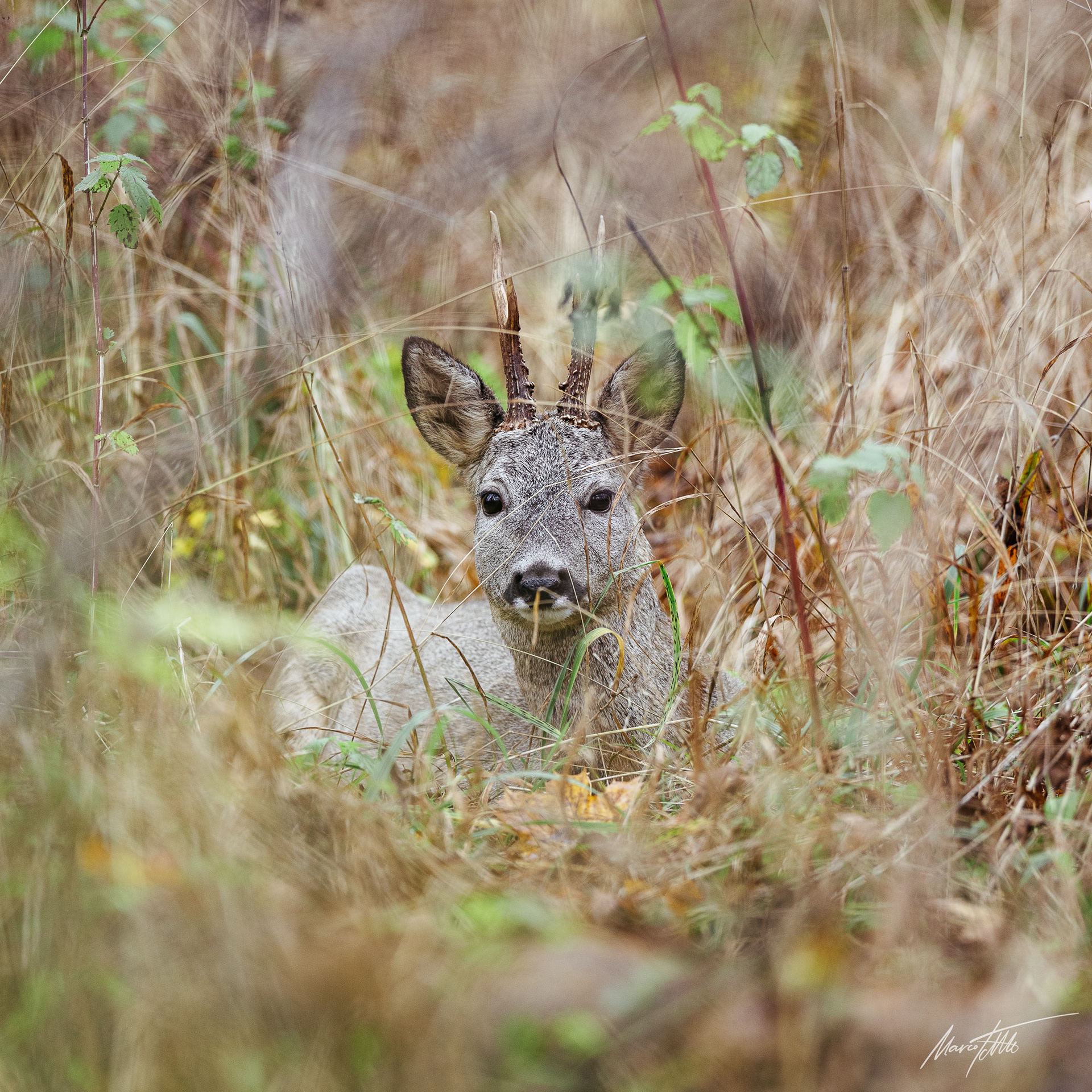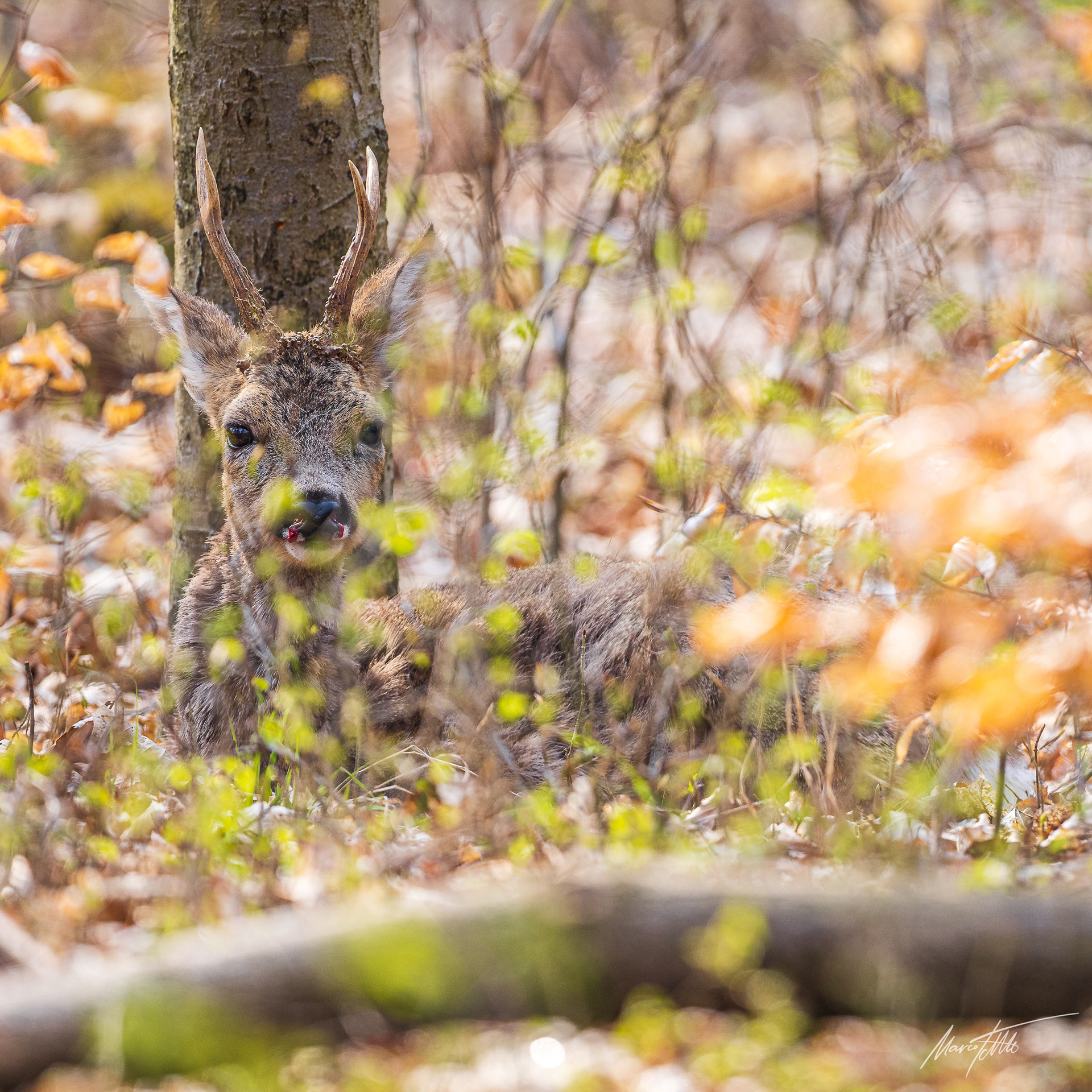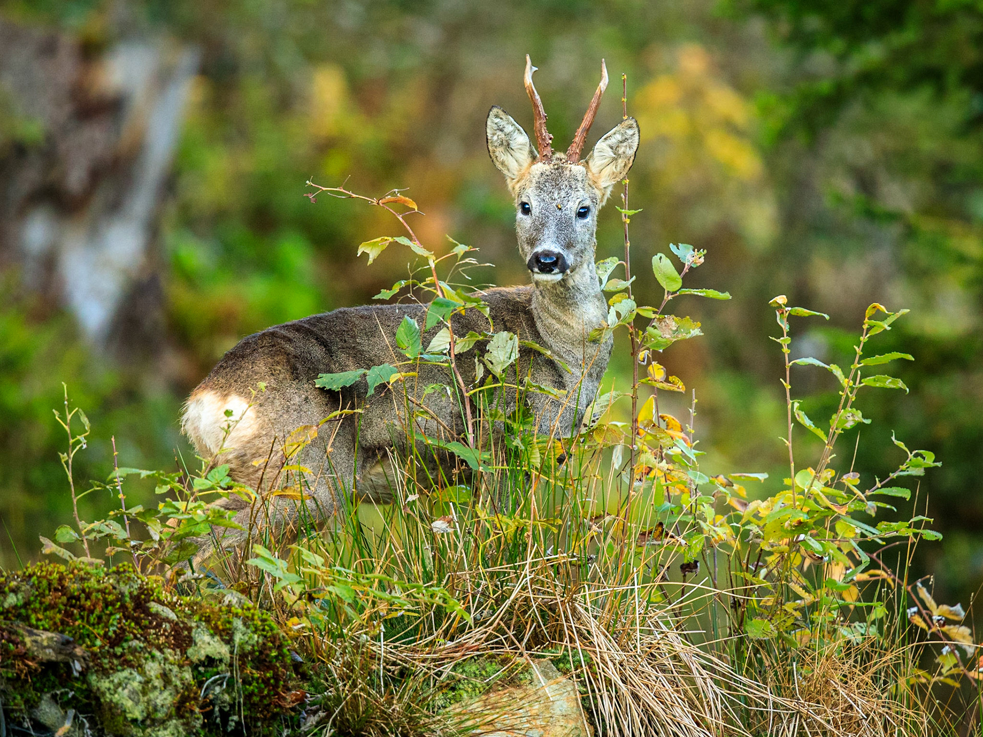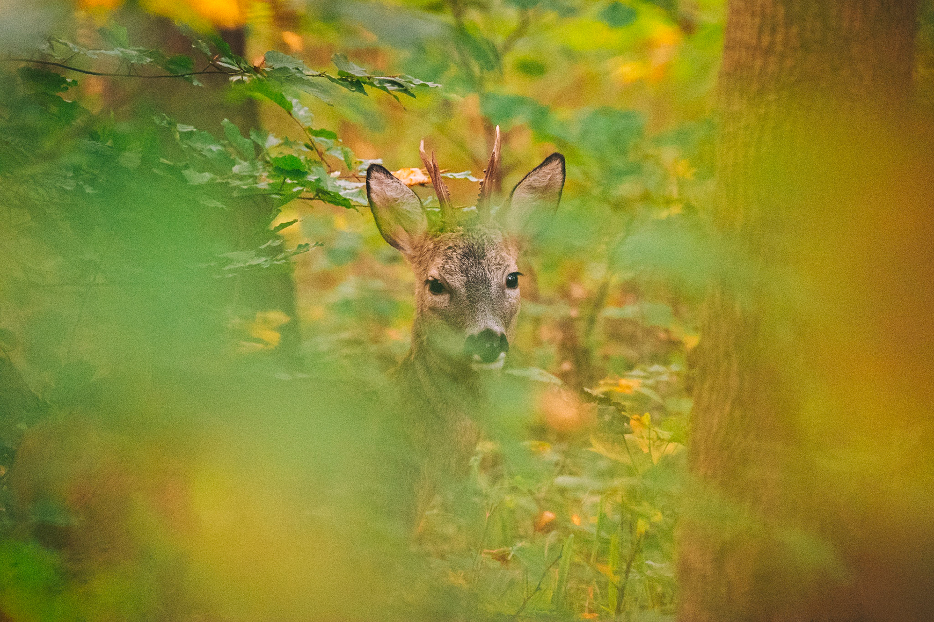 Alter Rehbock im Bast (Knöpfe) sichert durch rtes Buchenlaub