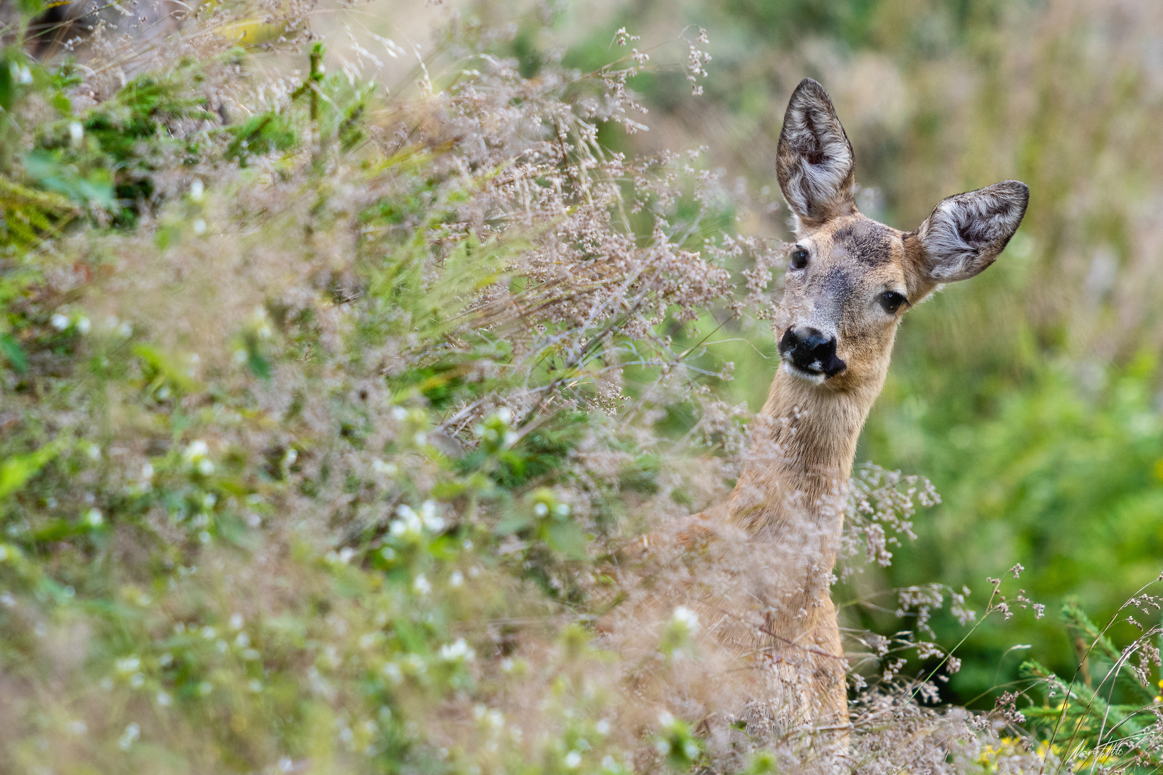 Alter Rehbock sichert durch hohes Gras auf einer Wiese am Waldrand