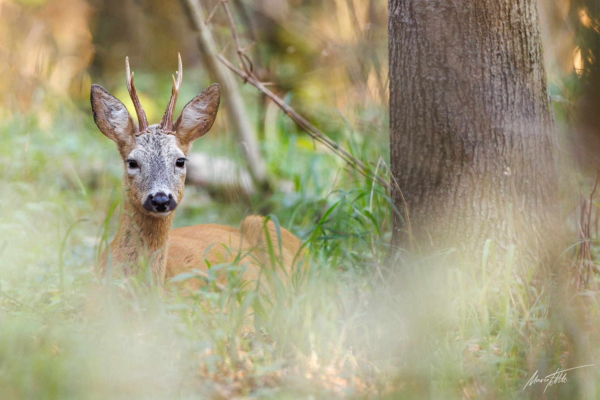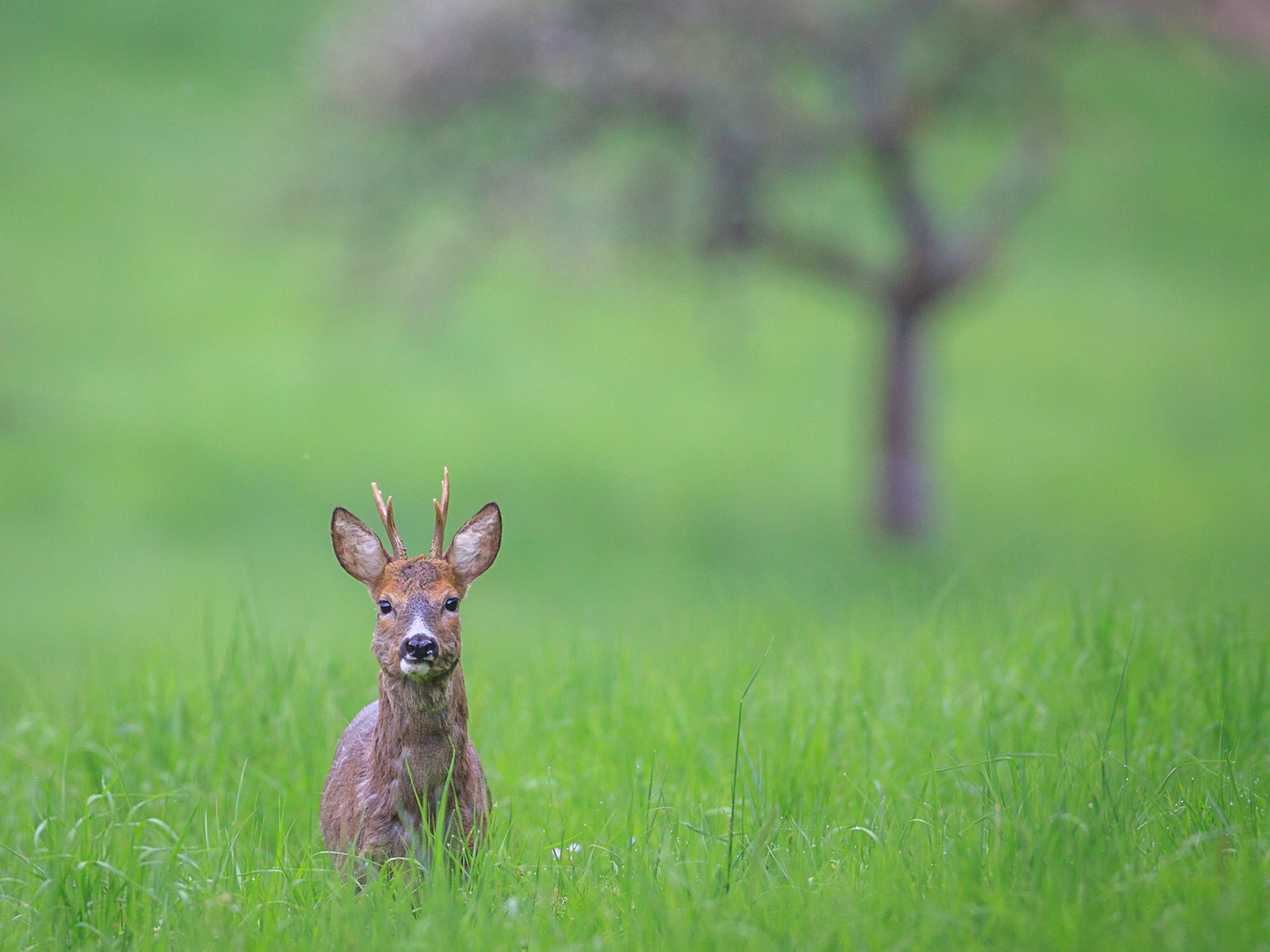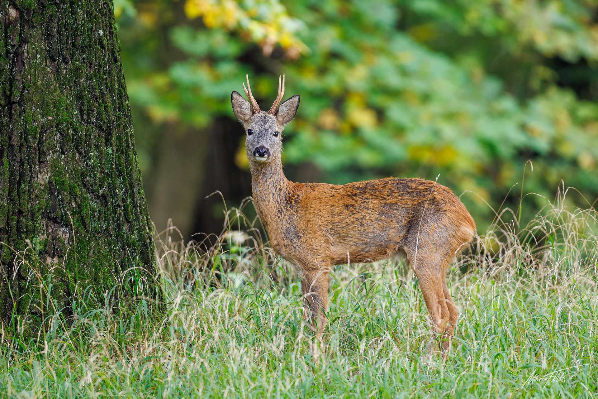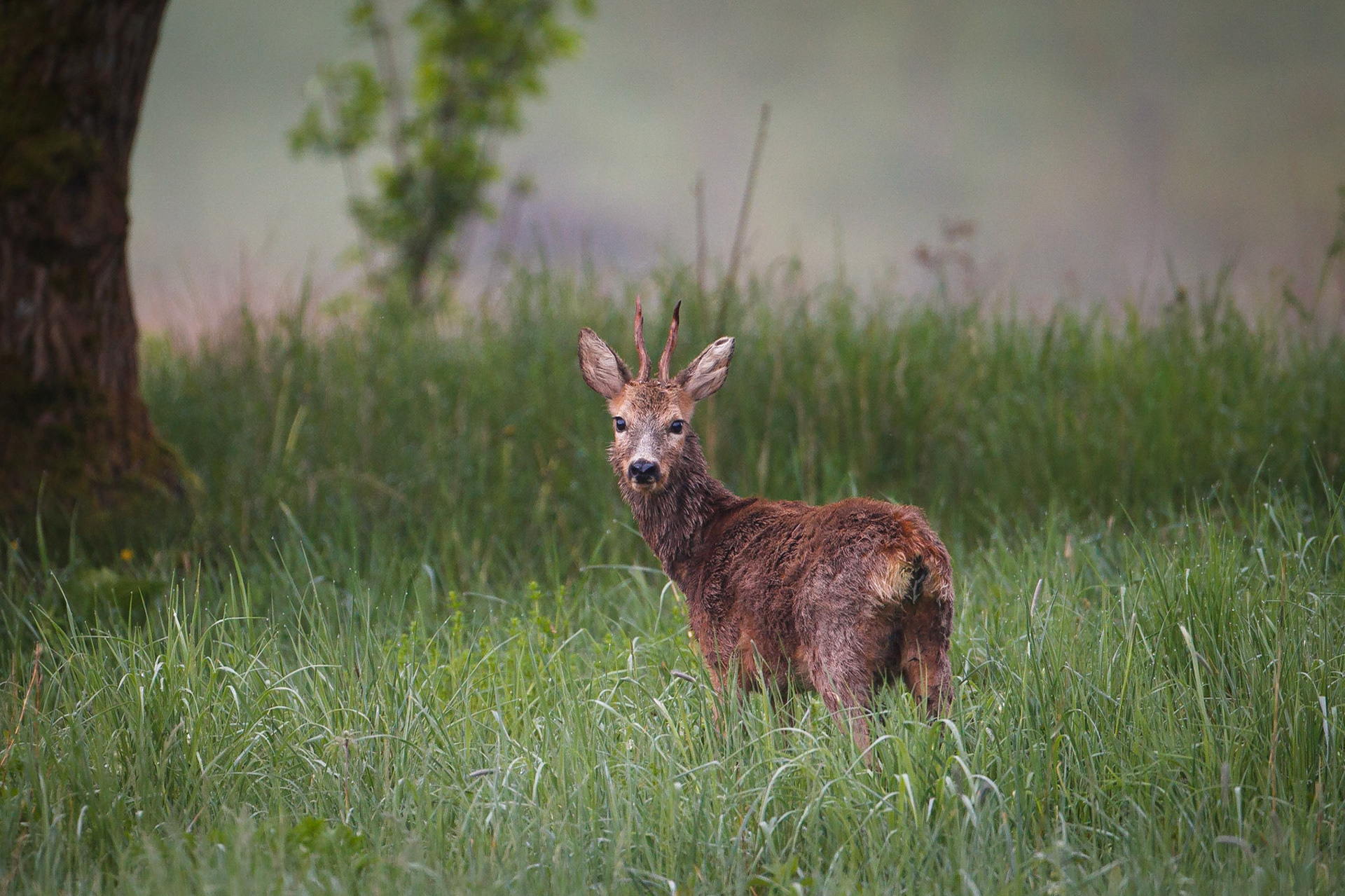 Alter abnormer und sehr knuffiger Rehbock im hohen Gras vor einem alten Eichenstamm