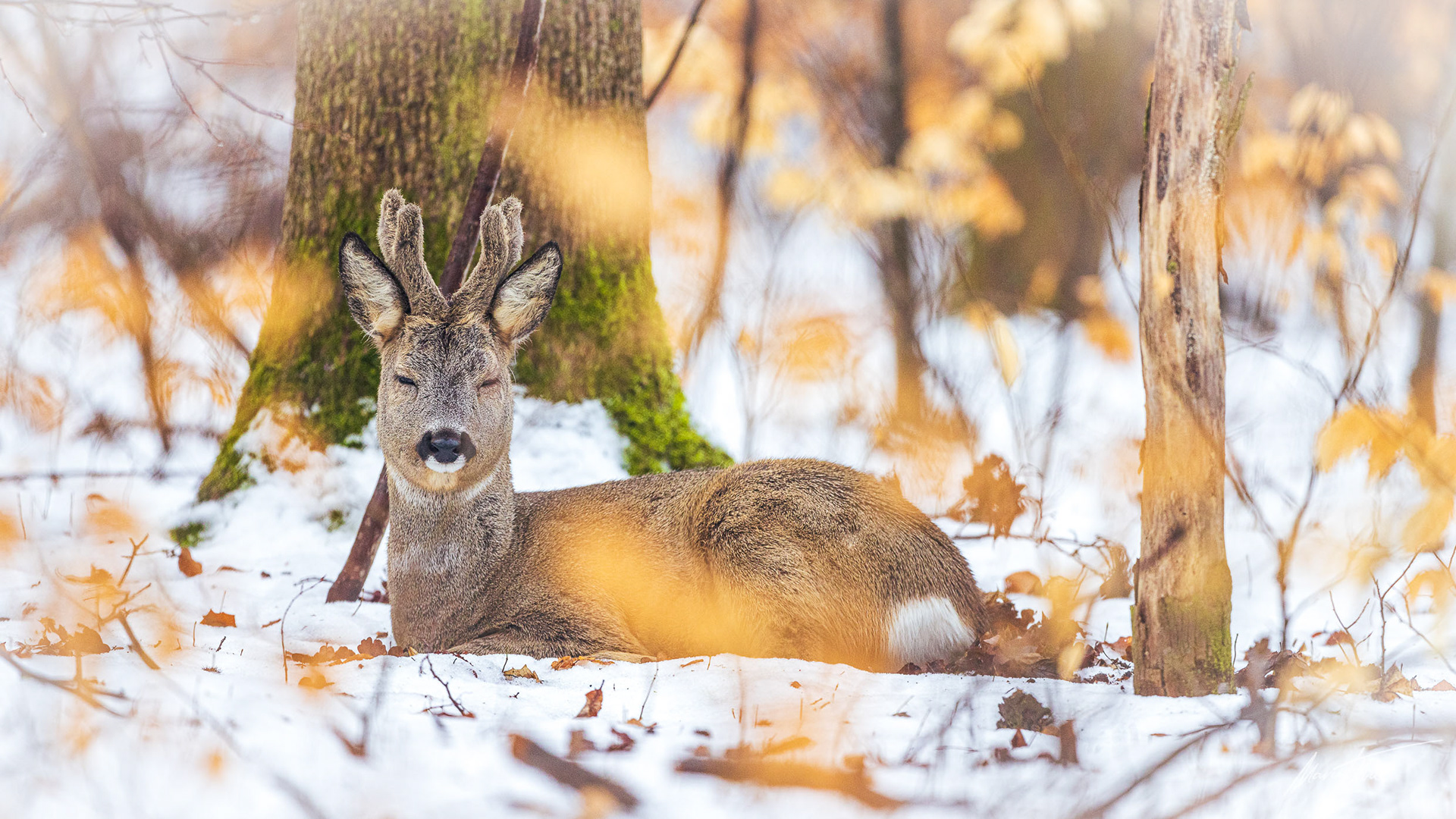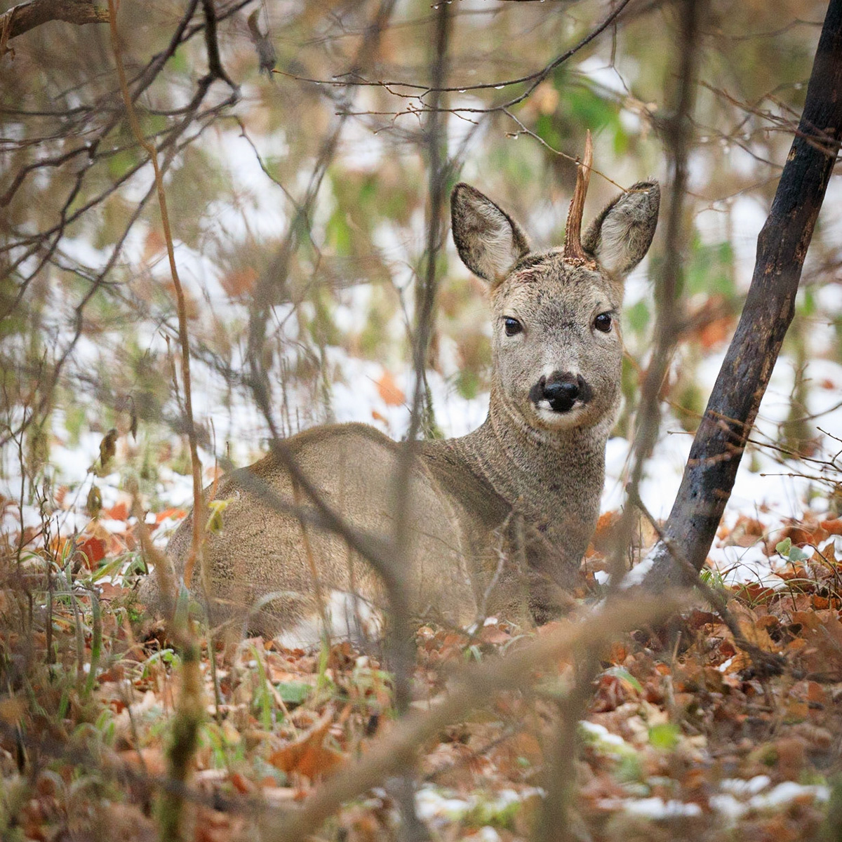 Alter Rehbock im Bast ruht im mit Schnee angezuckerten Buchenwald