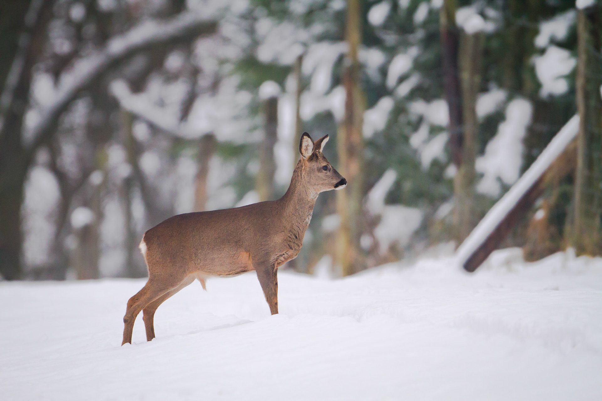 Ein Schmalreh sichert vor einem umgestürzten Baumstamm in den verschneiten Winterwald