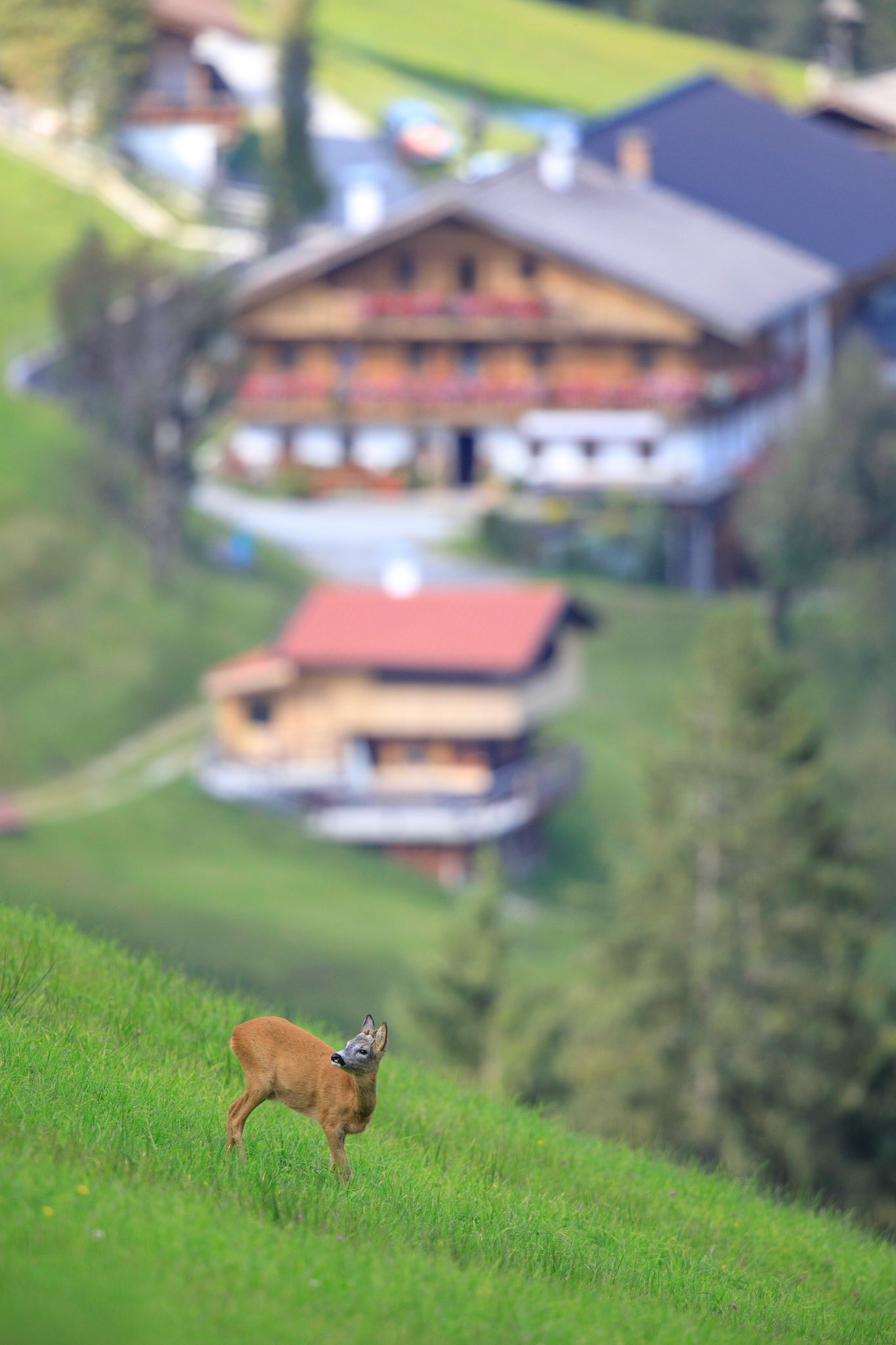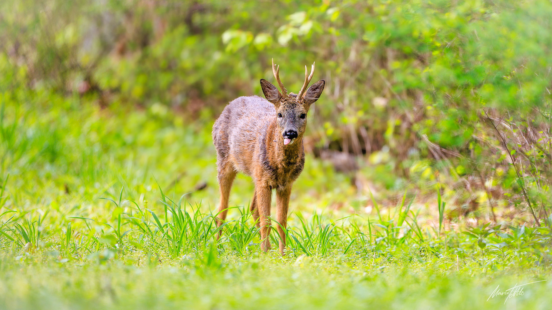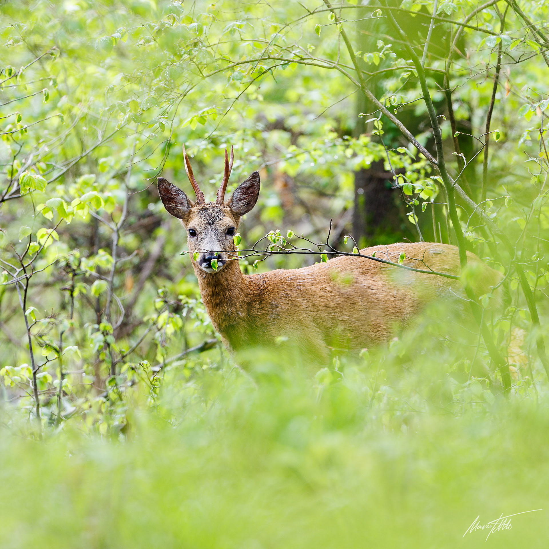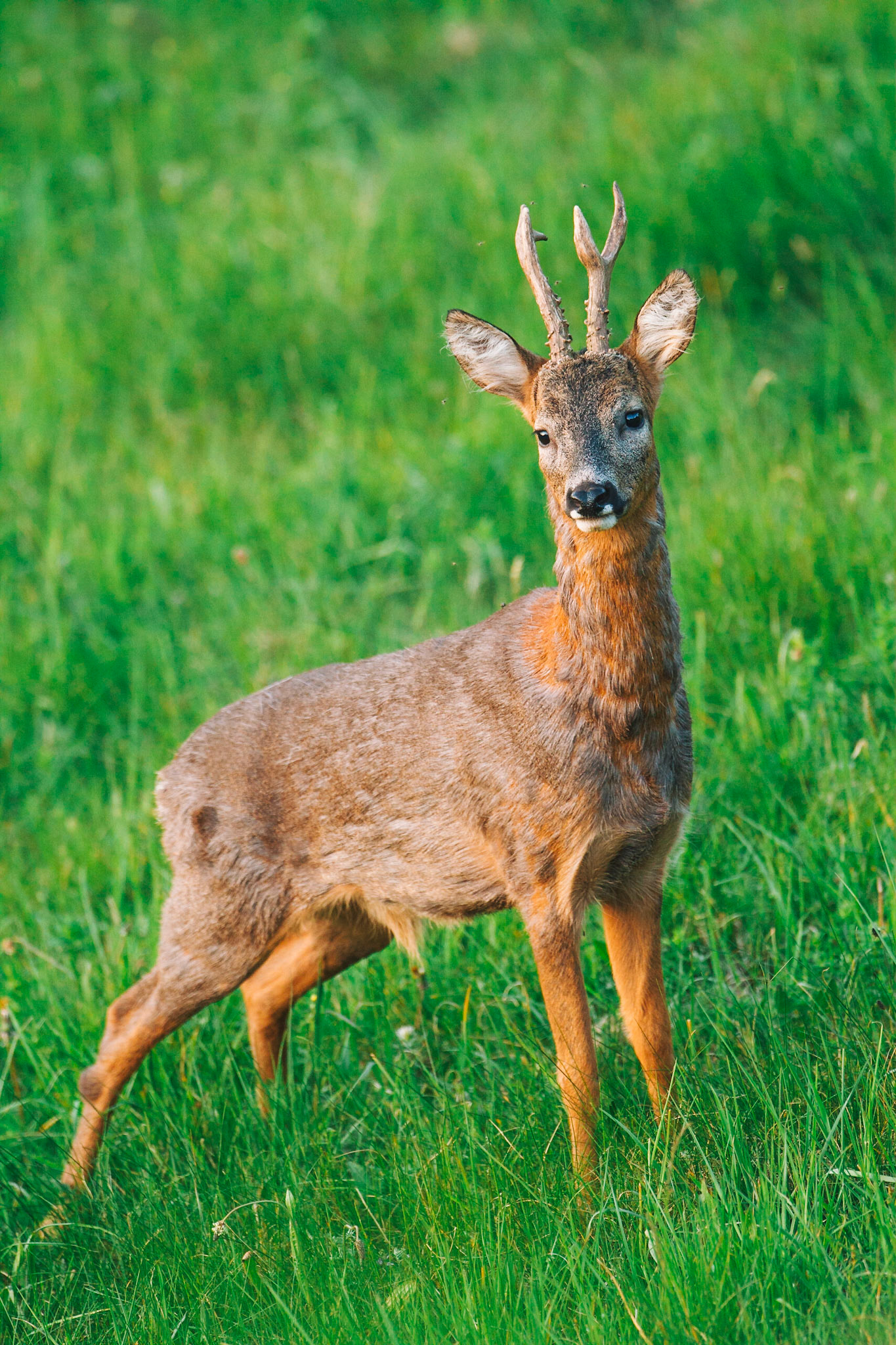 Alter Bock mit einseitig abgebrochenen Sprossen sichert in frischem Grün zurück und leckt sich den Windfang