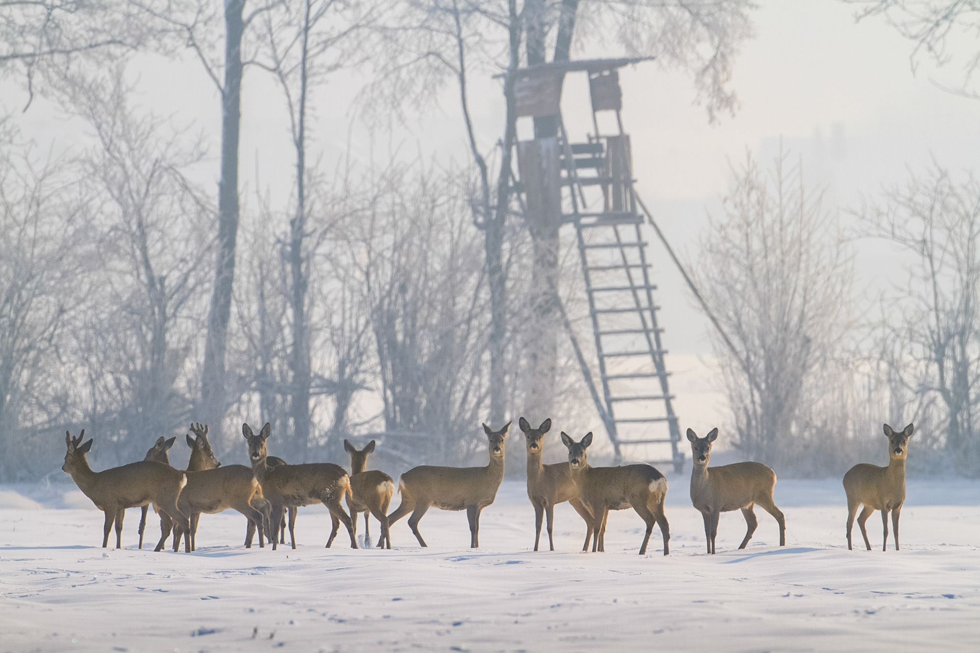 Eine uralte Ricke mit glubschigen Lichtern Augen im Hochwald bei leichtem Schnee