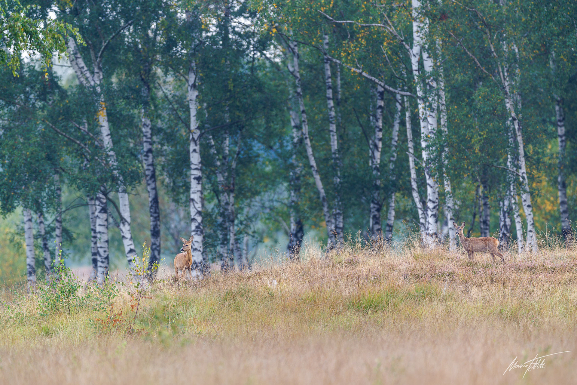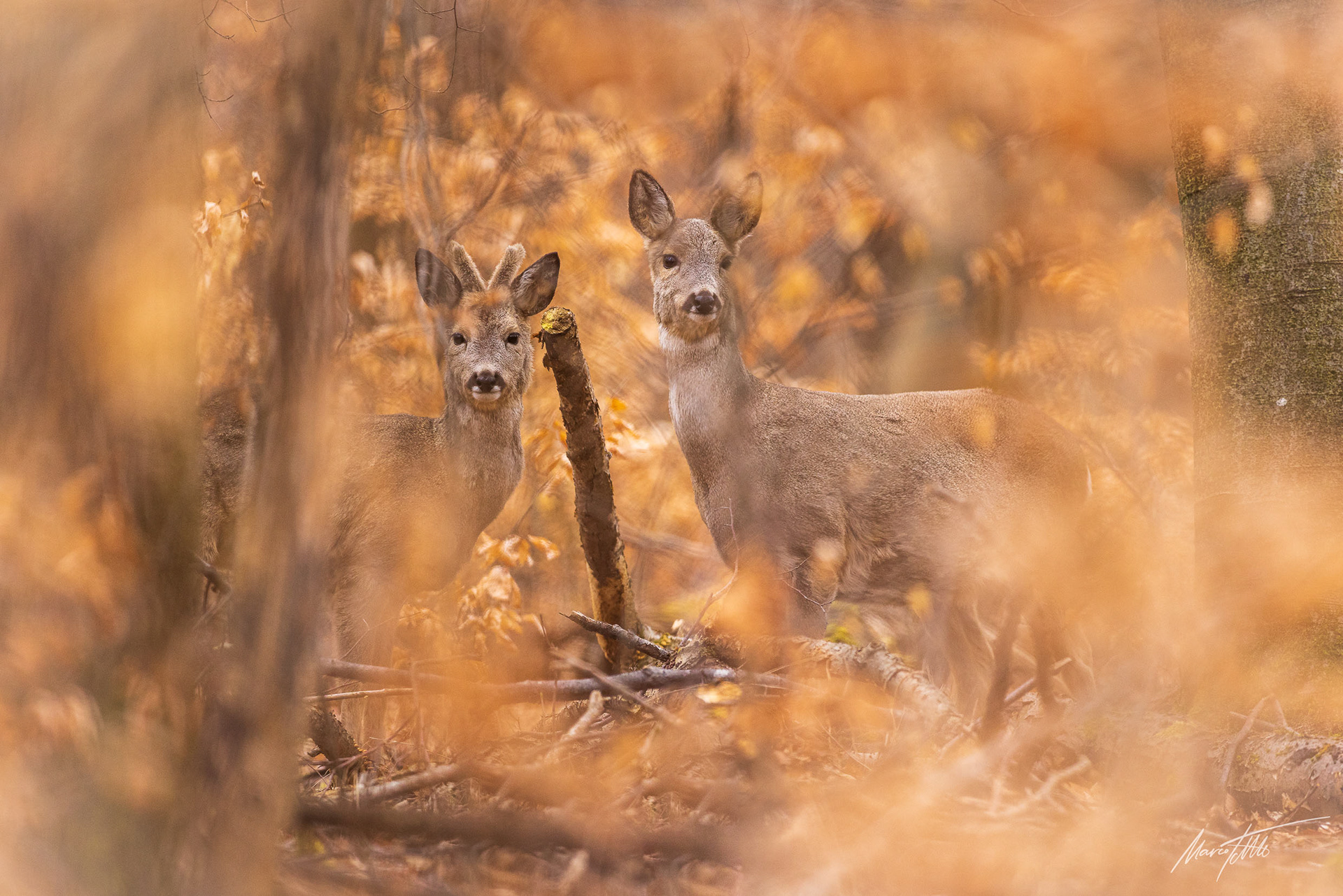 Alter Rehbock im Bast verhofft in von Laub rötlich gefärbtem Hochwald - Ricke im Hintergrund