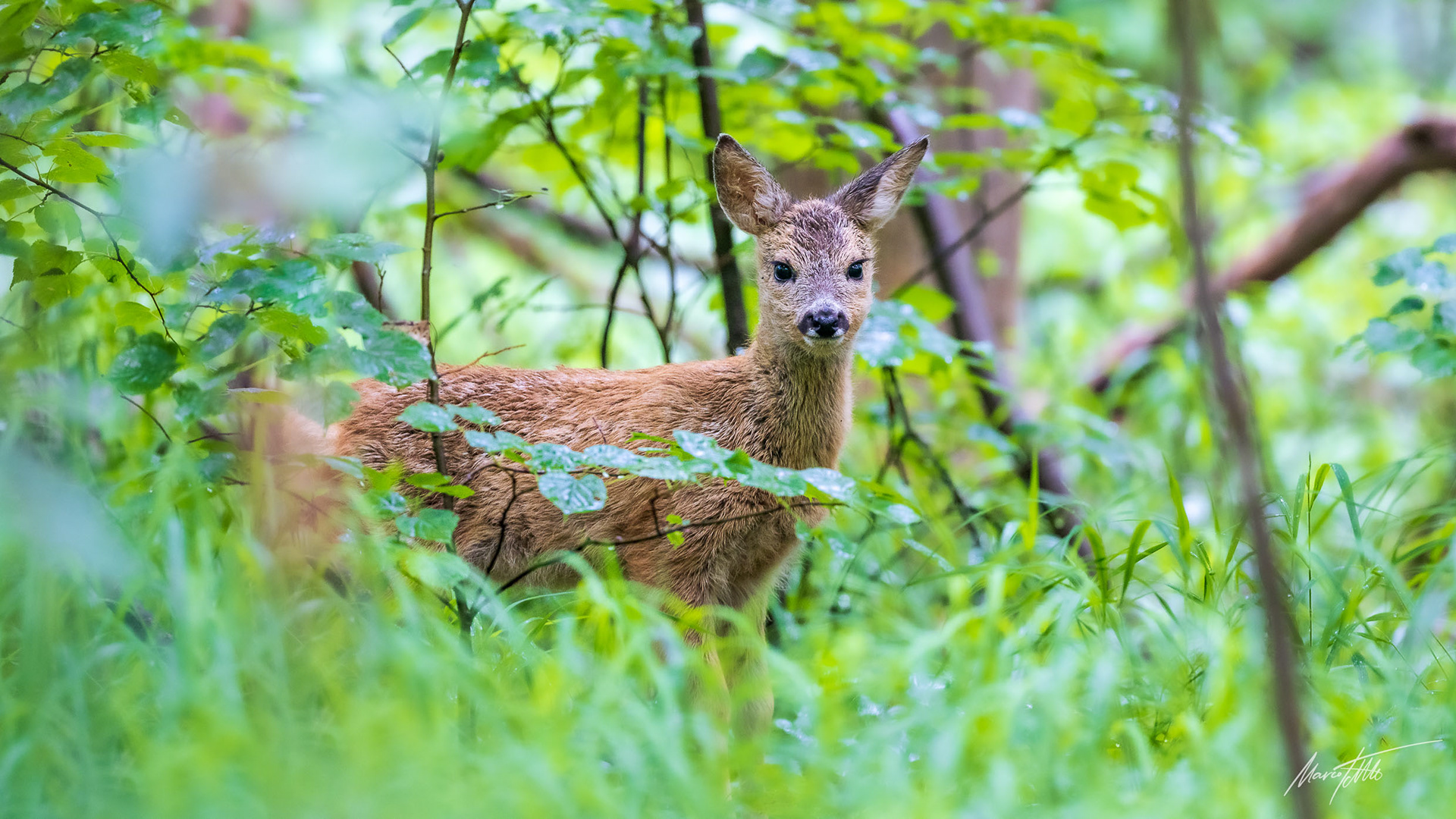 Geflecktes Rehkitz im grünen Unterholz