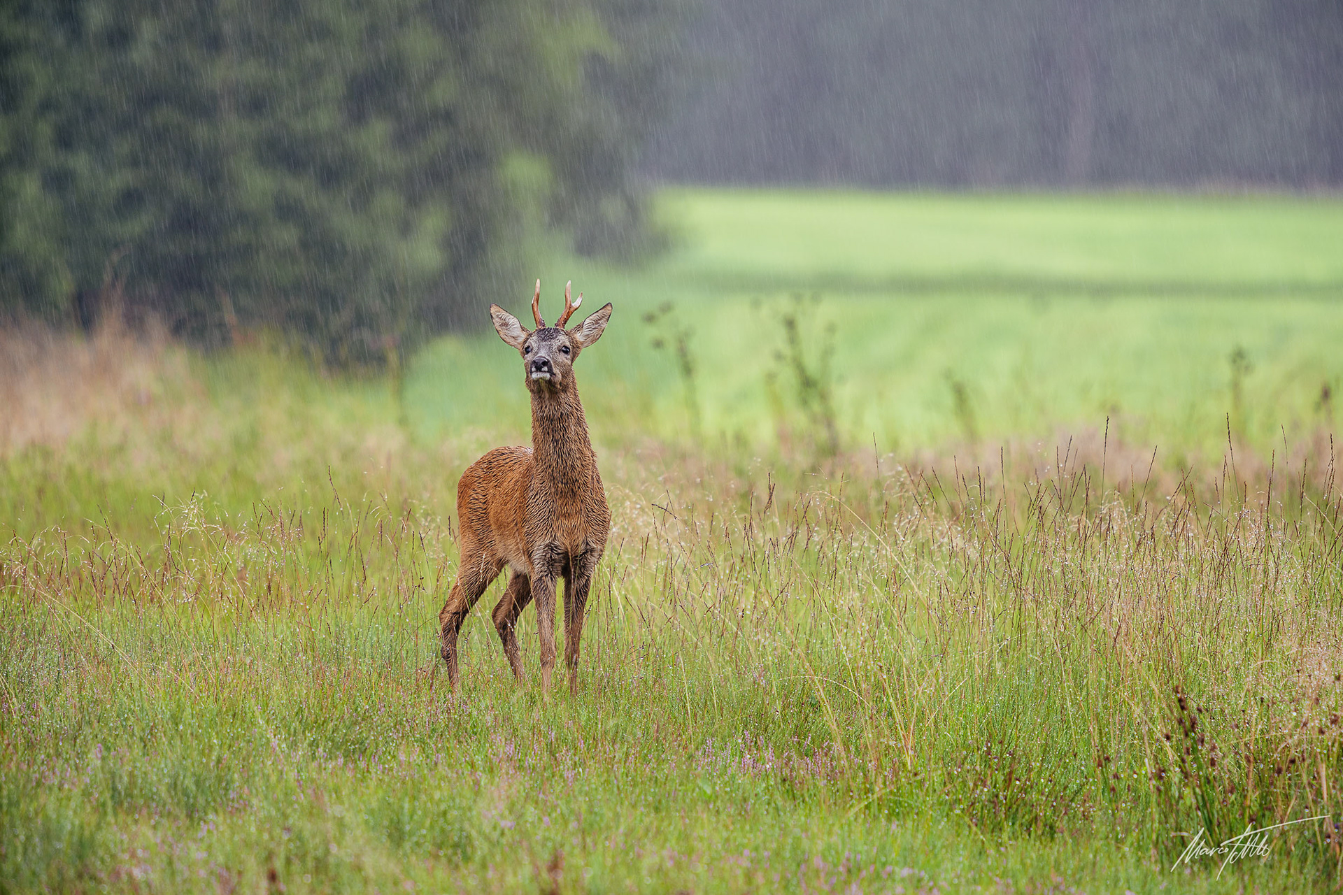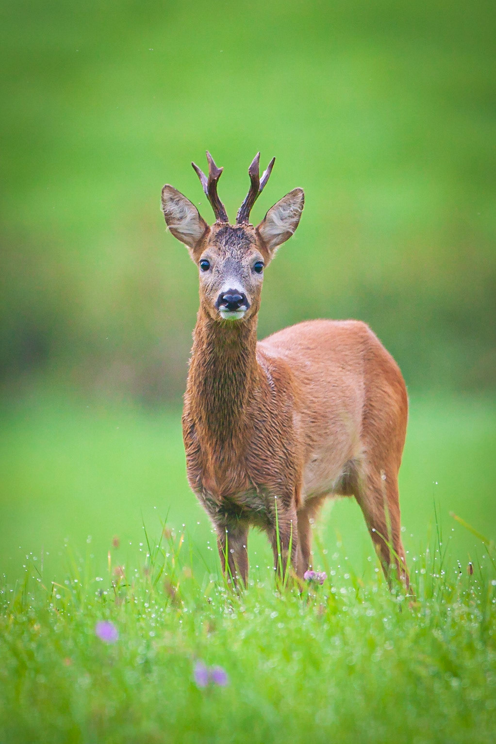 Alter Rehbock mit glatten Stangen im ergrünenden Frühlingswald im Regen
