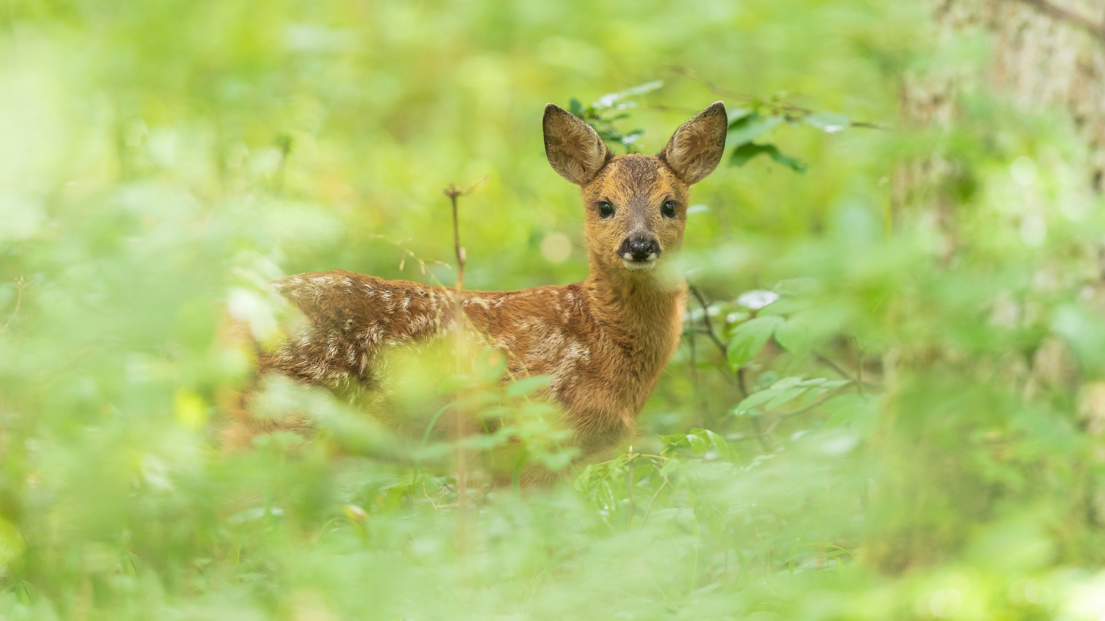 Ein Rehkitz im dichten Unterholz.